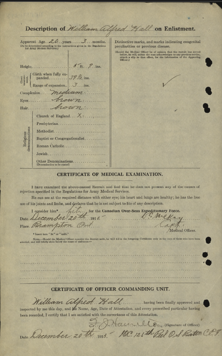 Family Search: Sergeant William Alfred Hall was born on 12 September 1895, in Canterbury, Kent, England, United Kingdom as the son of Hall and Elizabeth. He immigrated to Canada in 1913 and lived in Toronto, York, Ontario, Canada in 1922. He registered for military service in 1915. In 1915, at the age of 20, his occupation is listed as farmer. He died on 9 July 1970, at the age of 74.