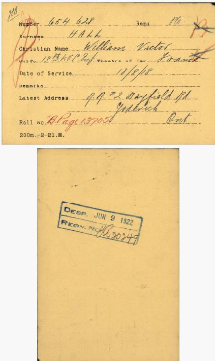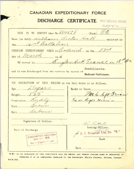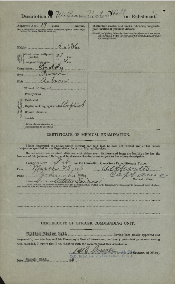 Family Search: Private William Victor Hall was born on 16 November 1897, in Essex, England, United Kingdom as the son of William Victor Hall and Alice Maud. He immigrated to Canada in 1913 and lived in Goderich, Huron, Ontario, Canada in 1916. He registered for military service in 1916. In 1916, at the age of 19, his occupation is listed as farmer in Goderich, Huron, Ontario, Canada.