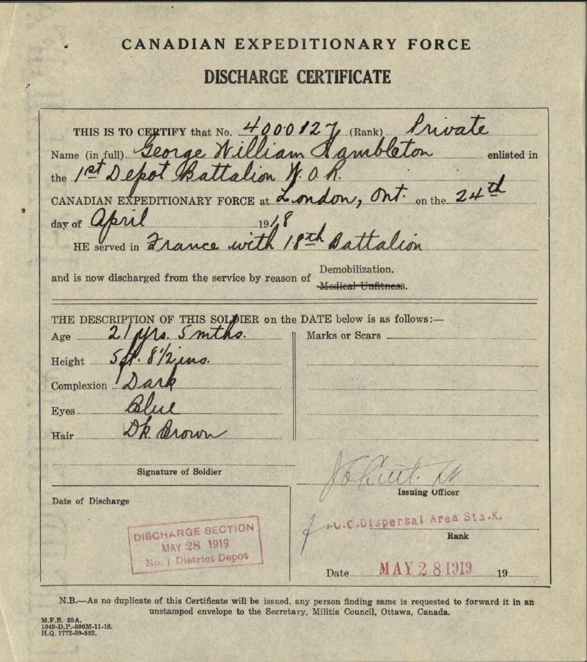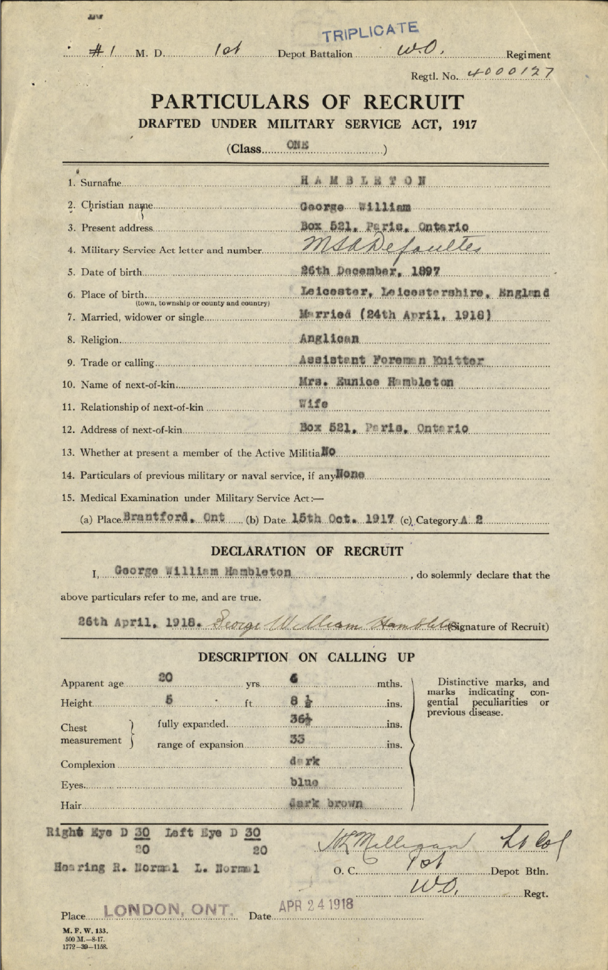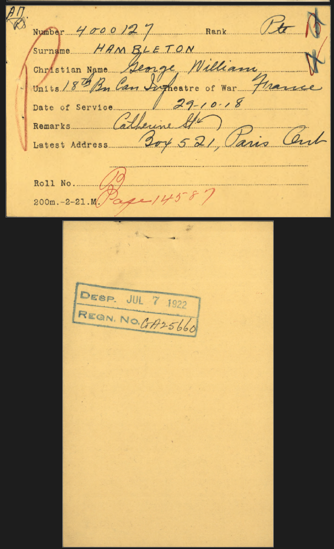 Family Search: When Private George William Hambleton was born on 26 December 1897, in Leicester, Leicestershire, England, United Kingdom, his father, George Hambleton, was 36 and his mother, Sarah Ann Hambleton, was 25. He married Eunice Wood on 23 March 1918, in Paris, South Dumfries Township, Brant, Ontario, Canada. They were the parents of at least 1 daughter. He lived in Paris, South Dumfries Township, Brant, Ontario, Canada in 1922. In 1960, at the age of 62, his occupation is listed as postal carrier, canada post in Kitchener, Waterloo, Ontario, Canada. He died on 29 November 1960, in Kitchener, Waterloo, Ontario, Canada, at the age of 62, and was buried in Woodland Cemetery, Kitchener, Waterloo, Ontario, Canada.