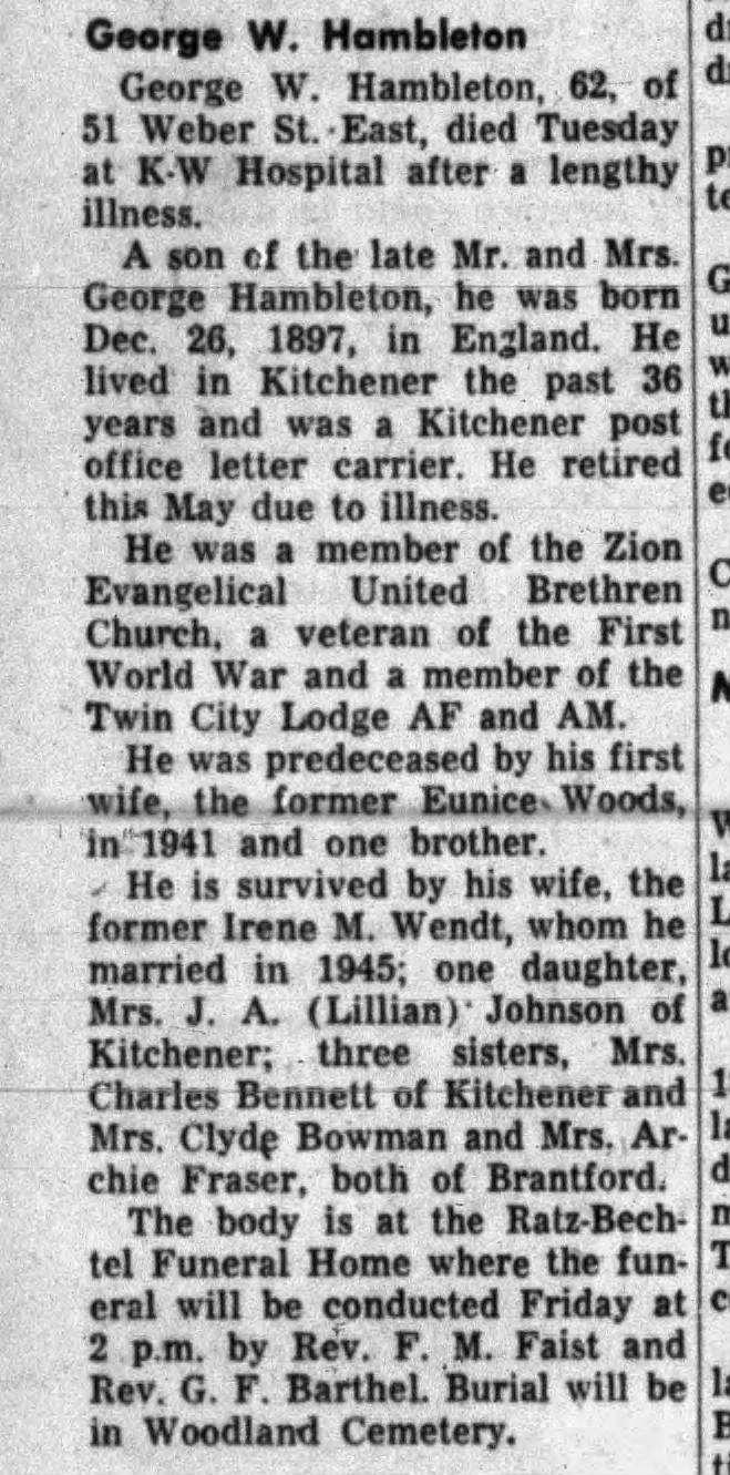 A son of the late Mr. and Mrs. George Hambleton, he was born Dec. 26, 1897, in England. He lived in Kitchener the past 36 years and was a Kitchener post office letter carrier. He retired this May due to illness.