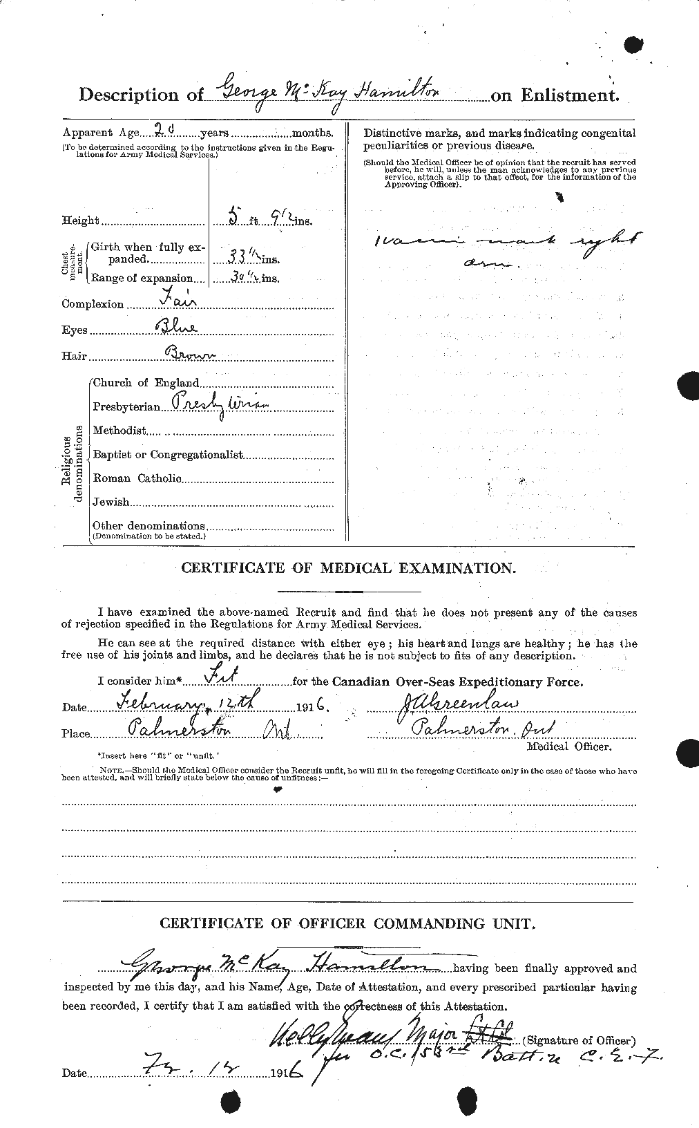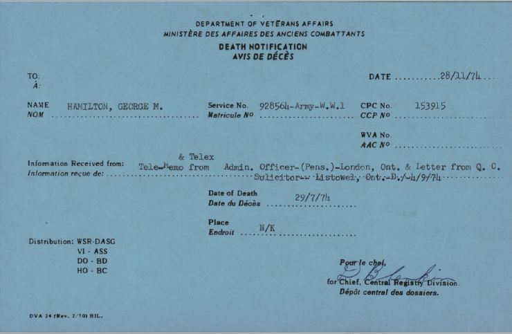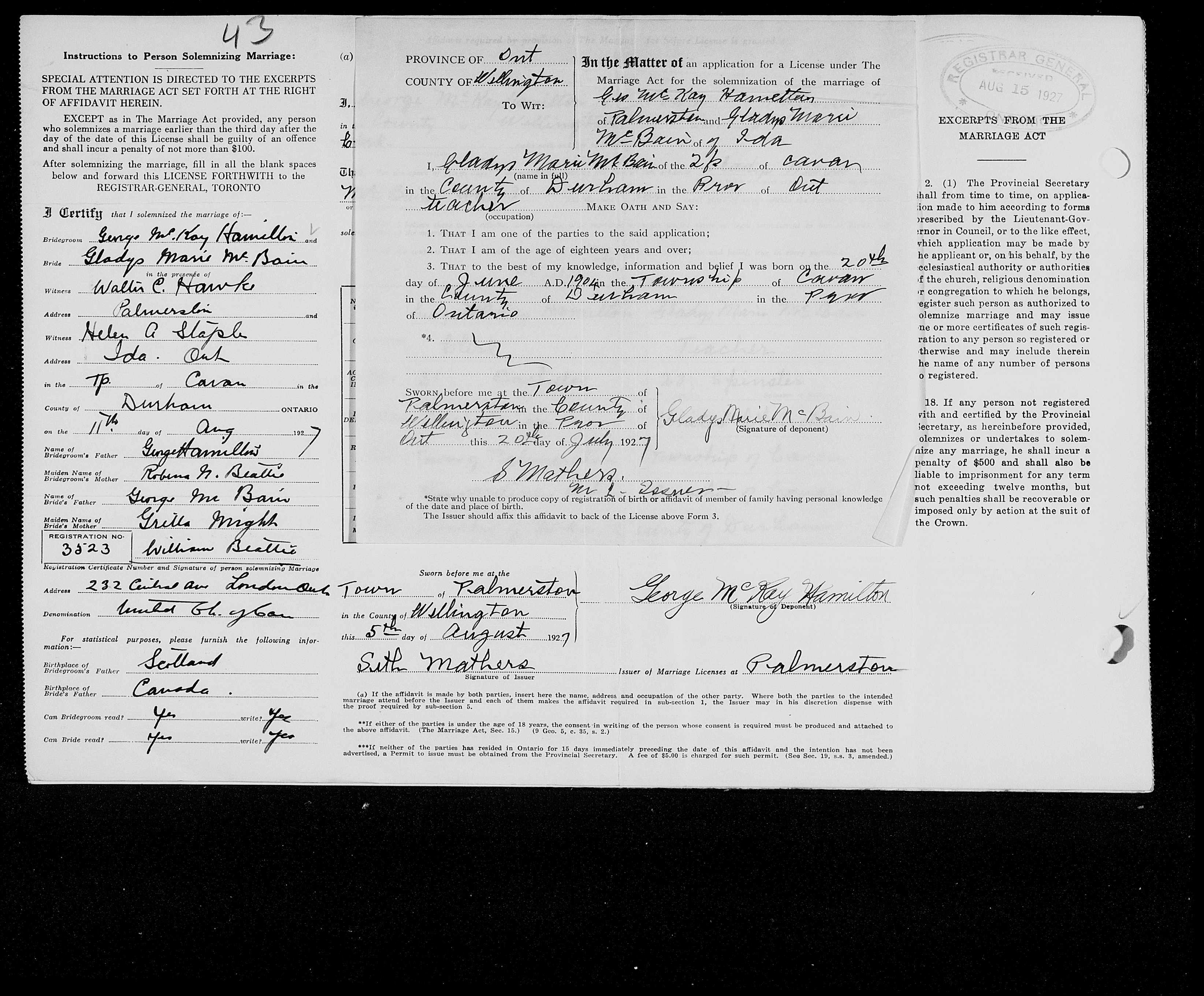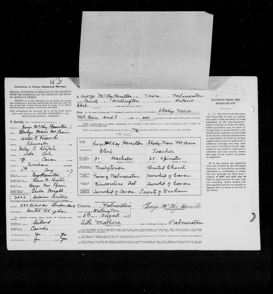 Family Search: George McKay Hamilton was born on 11 December 1896, in Kincardine, Bruce, Ontario, Canada as the son of George Hamilton and Robina Noble Beattie. He married Gladys Marie McBain on 20 July 1927. They were the parents of at least 1 son and 1 daughter. He lived in Palmerston, Perth, Ontario, Canada for about 6 years. He registered for military service in 1916. In 1916, at the age of 20, his occupation is listed as trucker in Palmerston, Perth, Ontario, Canada. He died on 9 July 1974, at the age of 77, and was buried in Palmerston Cemetery, Palmerston, Minto, Wellington, Ontario, Canada.