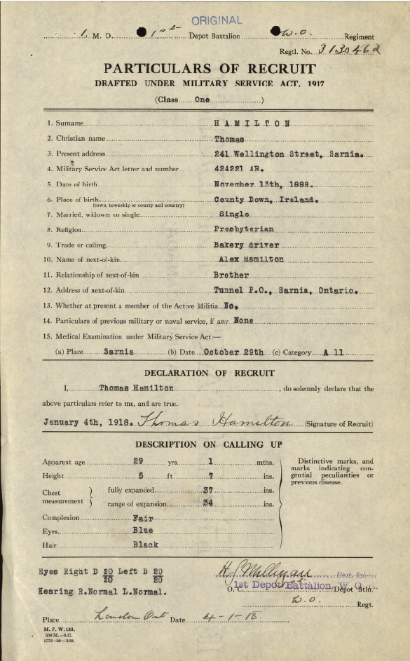 He reported for military service under the MSA (1917) at London, Ontario on 4 January 1918.