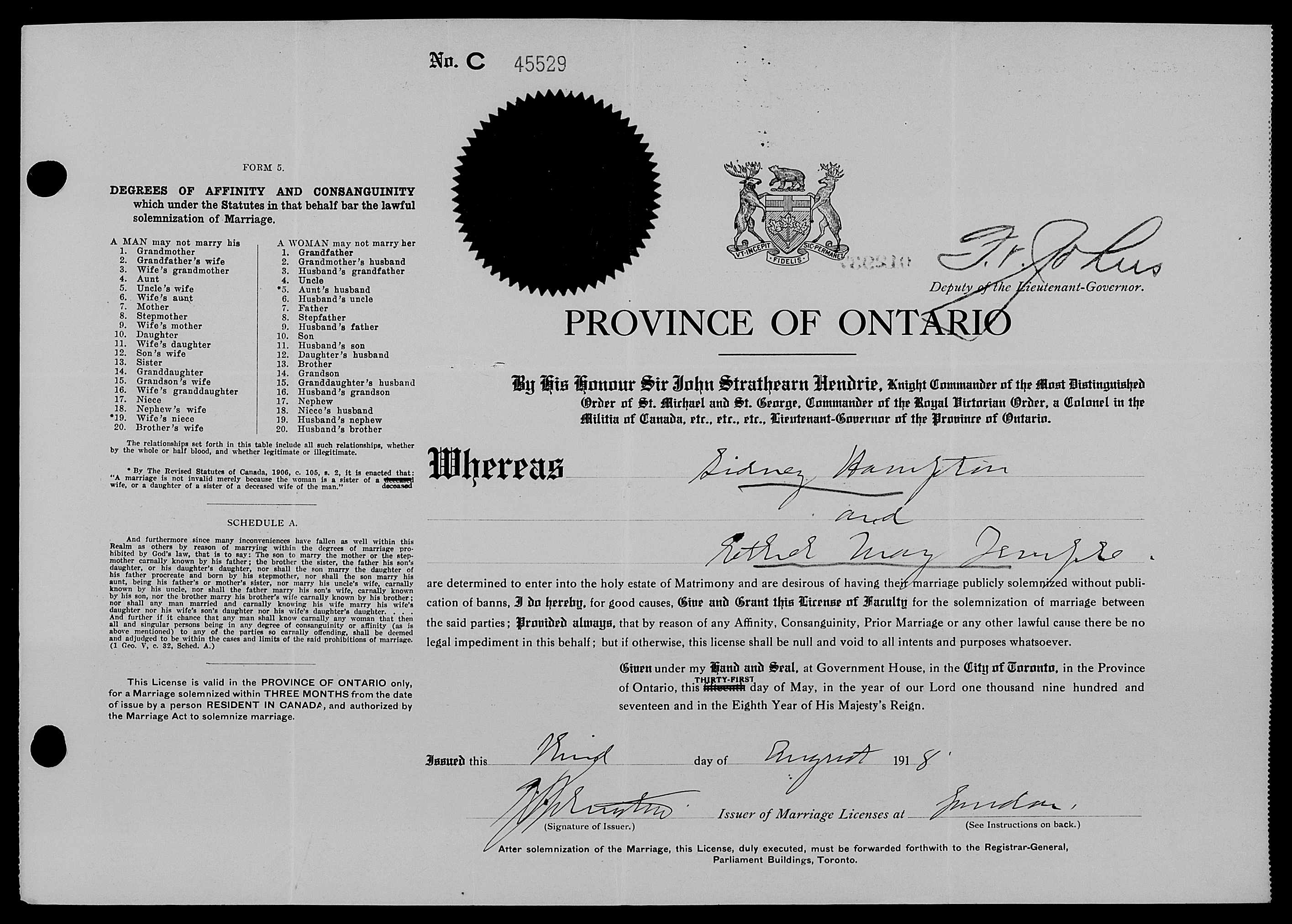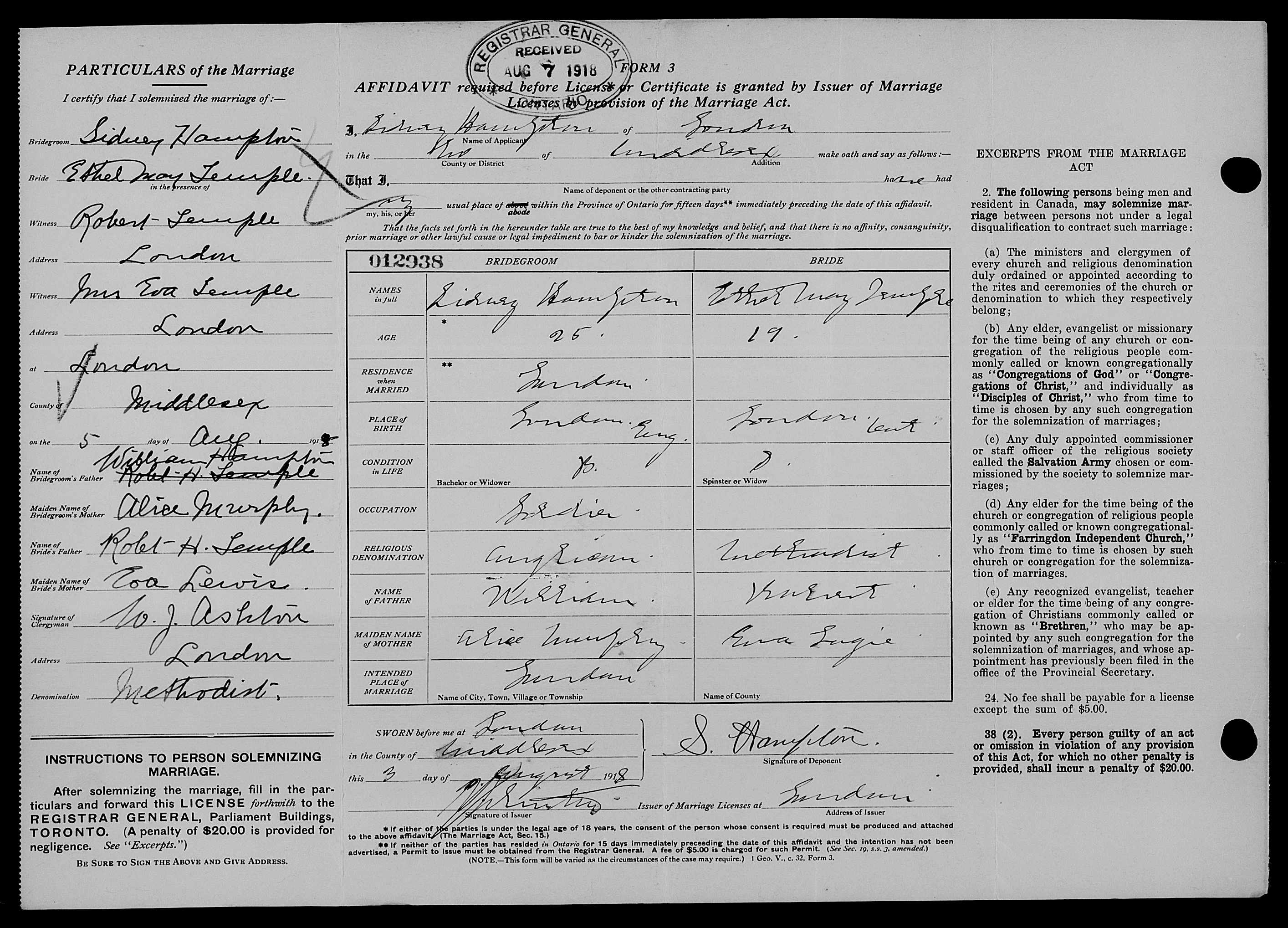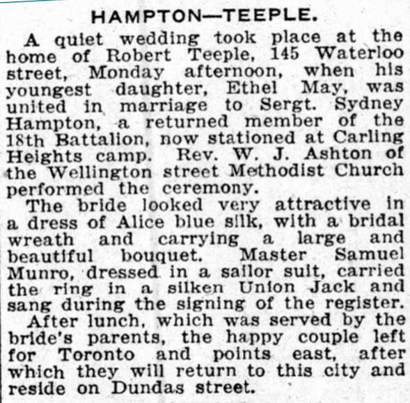 Family Search: When Sergeant Sydney Hampton was born on 14 April 1894, in Leytonstone, Essex, England, United Kingdom, his father, William Henry Hampton, was 29 and his mother, Alice Annie Murphy, was 31. He married Ethel May Temple on 5 August 1918, in London, Ontario, Canada. They were the parents of at least 1 son and 1 daughter. He lived in Bethnal Green, London, England, United Kingdom in 1901. He registered for military service in 1914. In 1914, at the age of 20, his occupation is listed as farming. He died on 8 October 1968, in London, Ontario, Canada, at the age of 74, and was buried in Mount Pleasant Cemetery, London, Ontario, Canada.