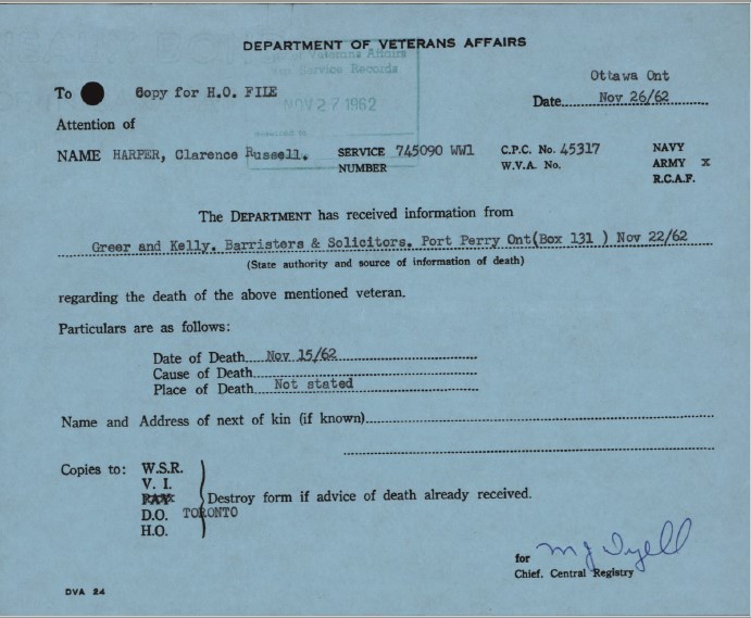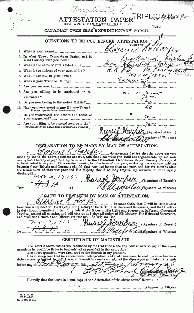 Harper, Clarence Russell: Service no. 745090 Digitized Service Record Source: Per record of promotion of Janson, Pete, reg. no. 53128. Find-A-Grave Family Search Share this: Click to email a link to a friend (Opens in new window) Email Click to share on Facebook (Opens in new window) Facebook Click to share on X (Opens in new window) X Click to share on Reddit (Opens in new window) Reddit Click to share on LinkedIn (Opens in new window) LinkedIn Click to print (Opens in new window) Print Click to share on Tumblr (Opens in new window) Tumblr Click to share on Pocket (Opens in new window) Pocket Click to share on Pinterest (Opens in new window) Pinterest Click to share on Telegram (Opens in new window) Telegram Click to share on WhatsApp (Opens in new window) WhatsApp Like Loading...