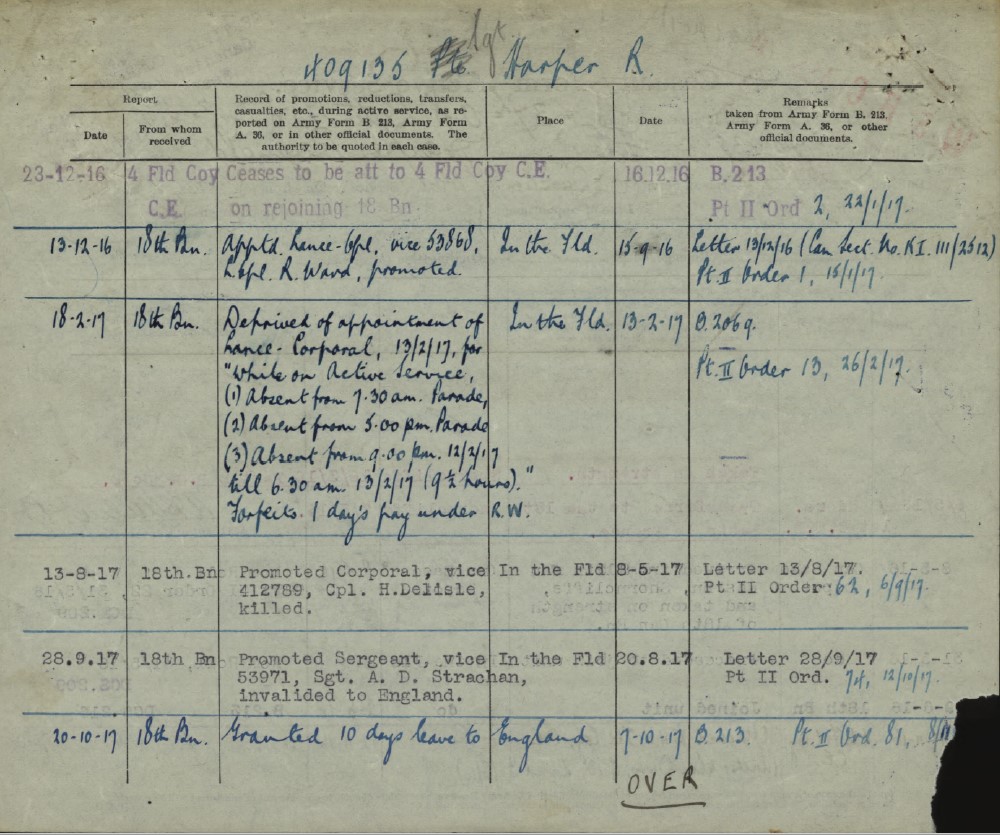 For conspicuous gallantry and devotion to duty in front of PASSCHENDAELE on November 10th 1917. After his Platoon Commander and all the other N.C.O of his Platoon had become casualties during a very heavy enemy bombardment of the Sector, Sergt Harper took charge, reorganized the Platoon, established it in a new position and connected up the flanks. He personally placed the men in the new position and supervised the work of consolidation. By his courage and resource he maintained his position and saved many further casualties.