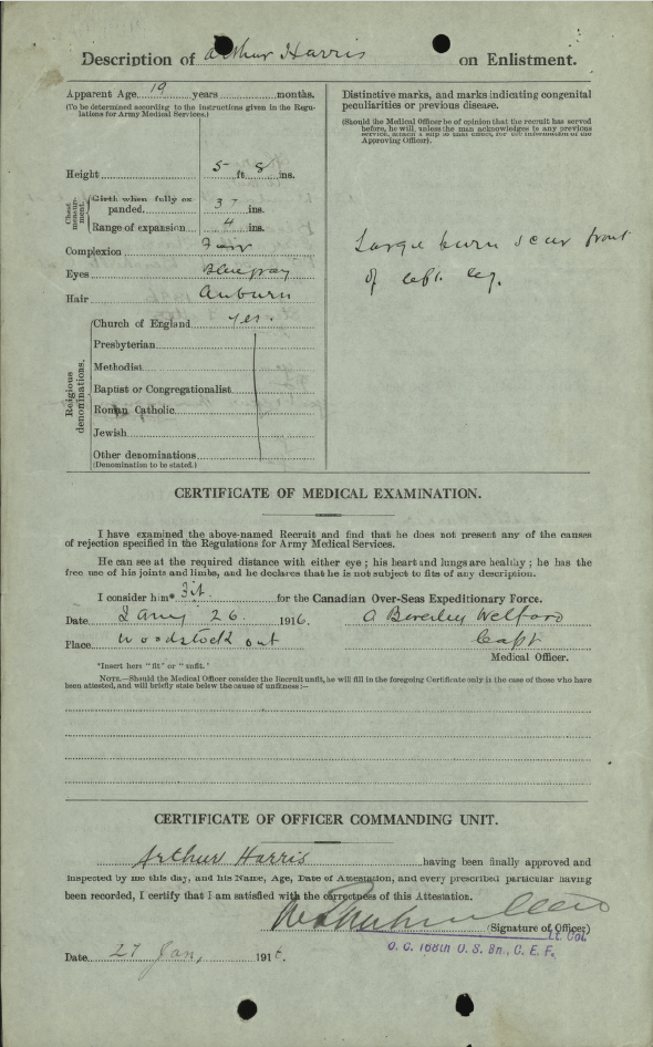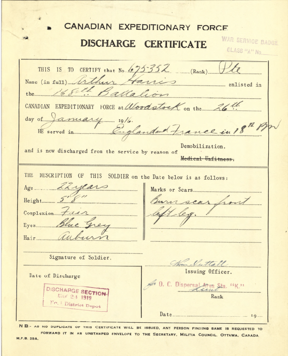 Family Search: When Private Arthur Vincent Harris was born on 30 June 1896, in Beachville, Oxford, Ontario, Canada, his father, John Harris, was 46 and his mother, Elizabeth Edwards, was 36. He married Louise Mear on 22 November 1920, in Toronto, York, Ontario, Canada. He lived in Woodstock, Oxford, Ontario, Canada in 1916 and Toronto, Ontario, Canada in 1953. He registered for military service in 1916. In 1916, at the age of 20, his occupation is listed as steam fitter in Woodstock, Oxford, Ontario, Canada. He died on 30 March 1953, in Toronto, York, Ontario, Canada, at the age of 56, and was buried in Prospect Cemetery, Toronto, Ontario, Canada.