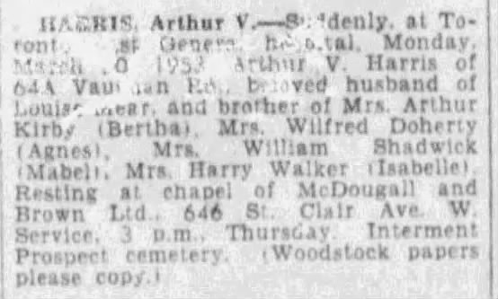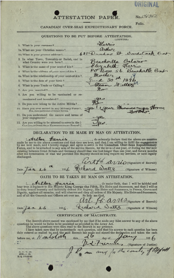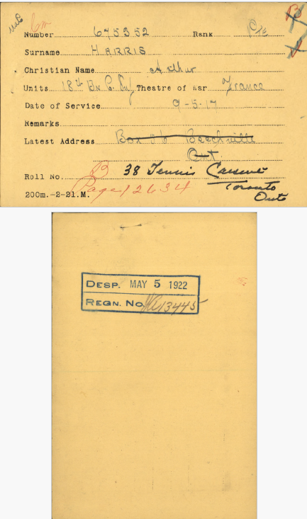 Family Search: When Private Arthur Vincent Harris was born on 30 June 1896, in Beachville, Oxford, Ontario, Canada, his father, John Harris, was 46 and his mother, Elizabeth Edwards, was 36. He married Louise Mear on 22 November 1920, in Toronto, York, Ontario, Canada. He lived in Woodstock, Oxford, Ontario, Canada in 1916 and Toronto, Ontario, Canada in 1953. He registered for military service in 1916. In 1916, at the age of 20, his occupation is listed as steam fitter in Woodstock, Oxford, Ontario, Canada. He died on 30 March 1953, in Toronto, York, Ontario, Canada, at the age of 56, and was buried in Prospect Cemetery, Toronto, Ontario, Canada.