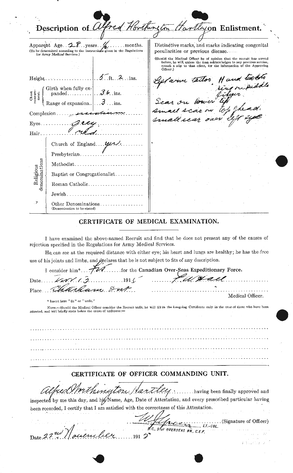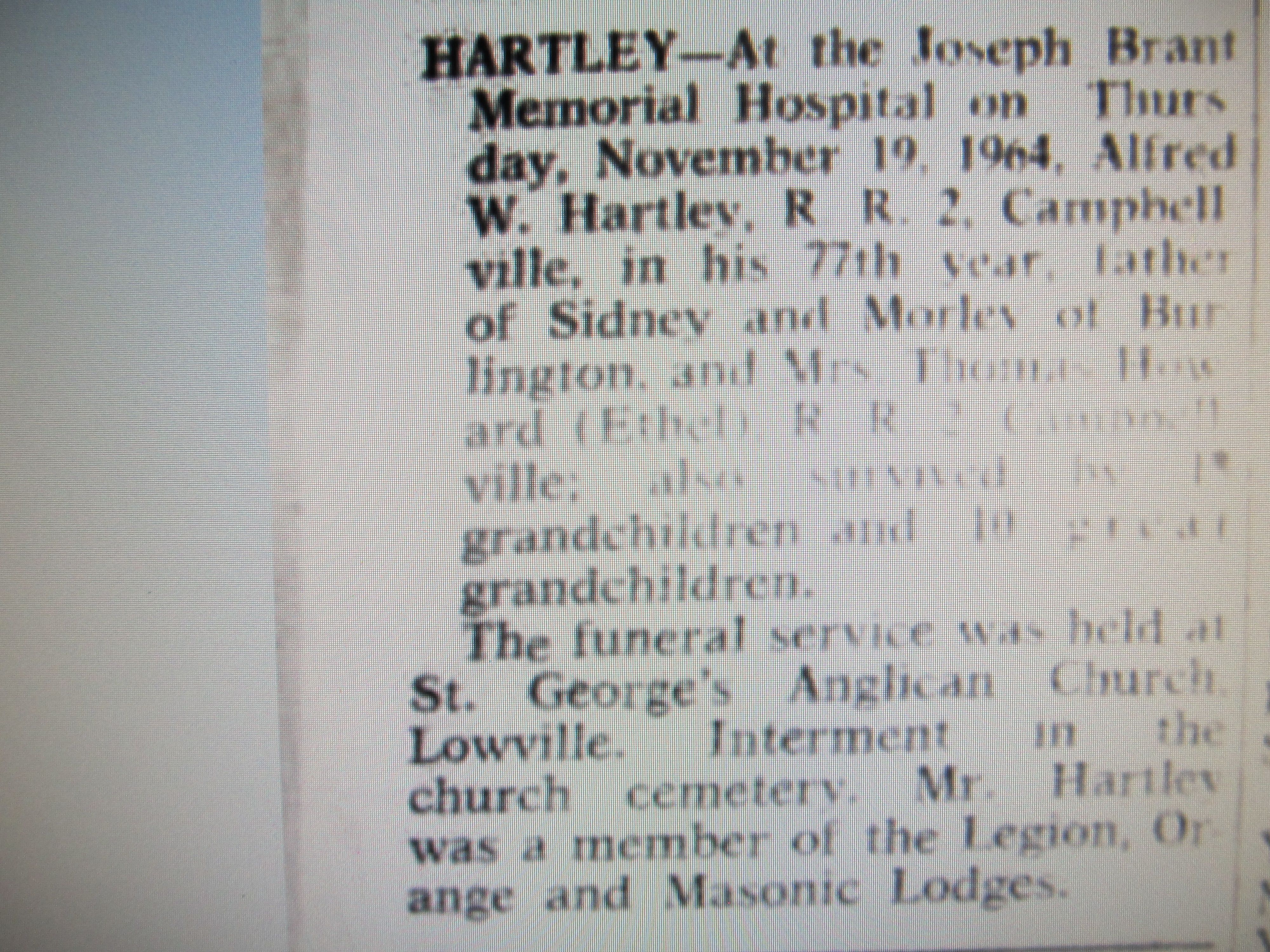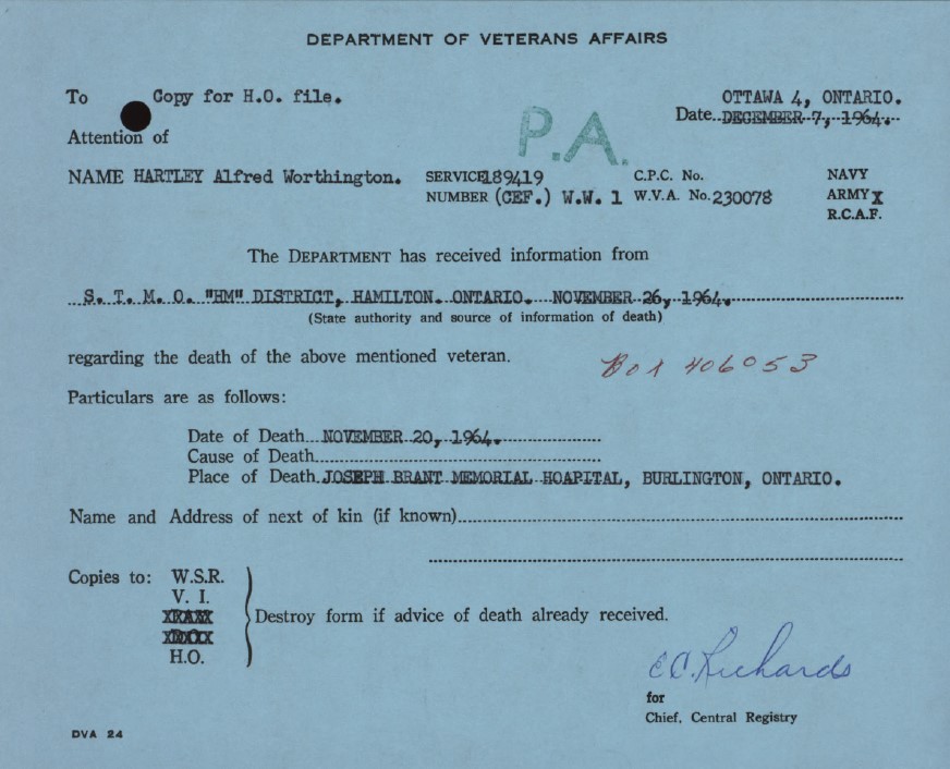 Family Search: When Private Alfred Worthington Hartley was born on 29 October 1887, in London, England, United Kingdom, his father, Alfred Edward Hartley, was 22 and his mother, Mary Phoebe Heaps, was 25. He married Ethel Gwendoline Lloyd on 25 December 1913, in Walkerville, Windsor, Essex, Ontario, Canada. They were the parents of at least 2 sons and 1 daughter. He immigrated to Detroit, Wayne, Michigan, United States in 1912 and lived in Nelson Township, Halton, Ontario, Canada in 1931 and Campbellville, Halton, Ontario, Canada in 1964. He registered for military service in 1915. In 1931, at the age of 44, his occupation is listed as laborer. He died on 20 November 1964, in Burlington, Halton, Ontario, Canada, at the age of 77, and was buried in Saint George’s Anglican Church Cemetery, Lowville, Burlington, Halton, Ontario, Canada.