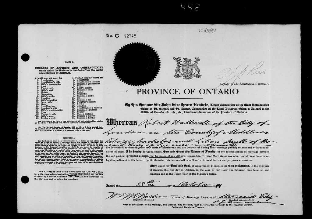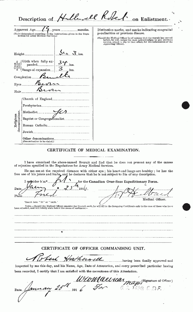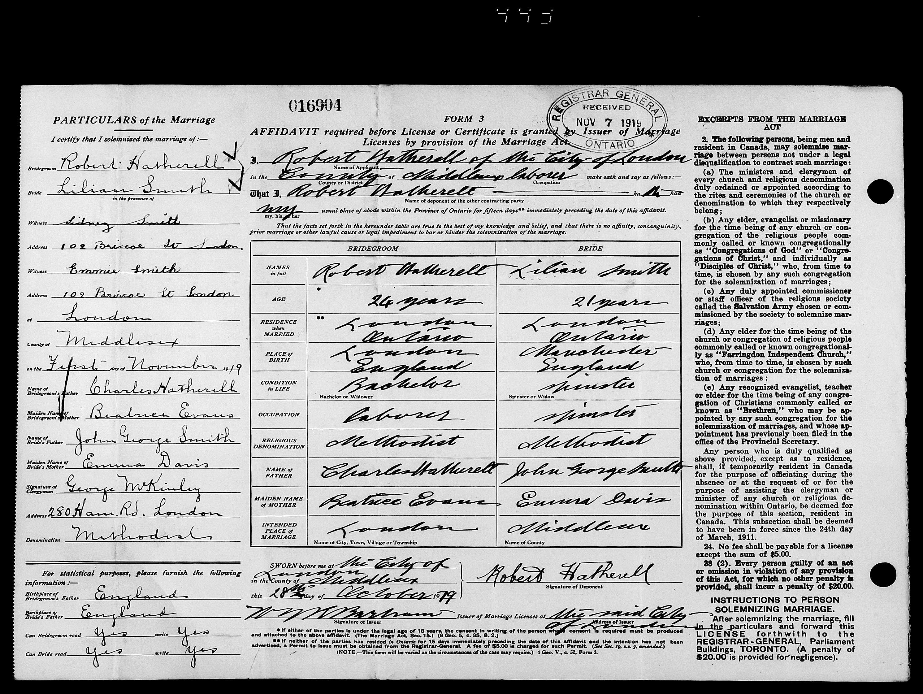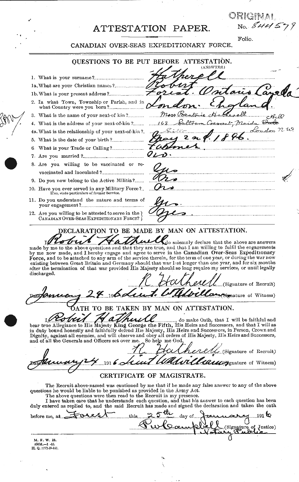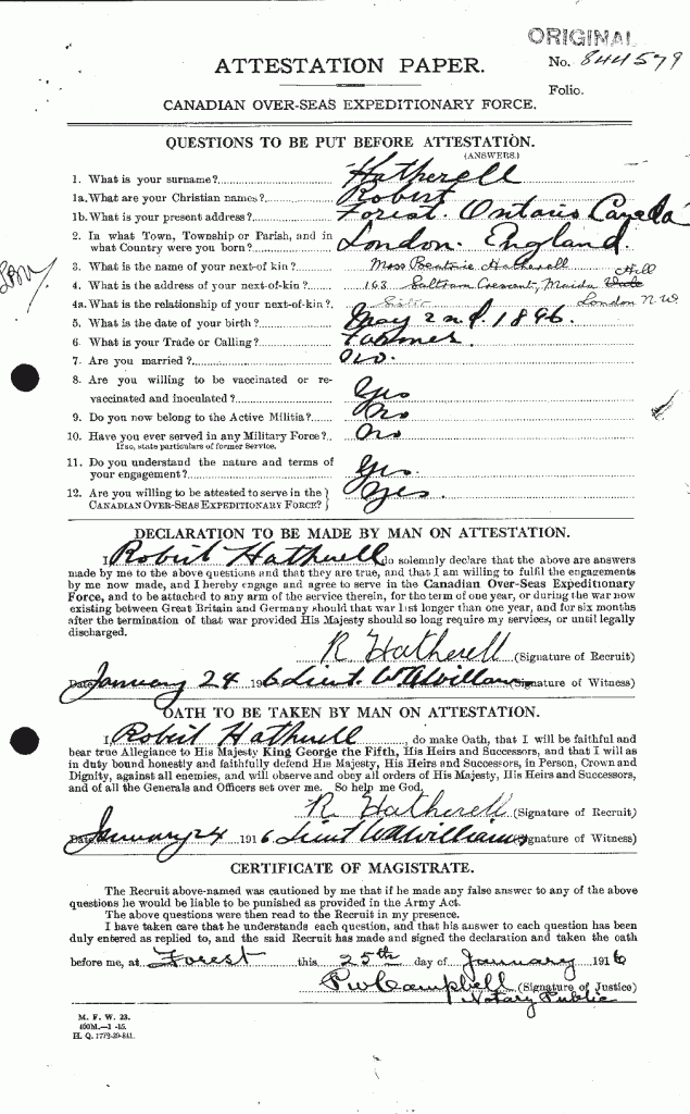 Family Search: Private Robert Hatherall was born on 2 May 1895, in City of London, England, United Kingdom as the son of Charles Hatherell and Beatrice Evans. He married Lilian Smith on 28 October 1919, in London, Ontario, Canada. He immigrated to Canada in 1910 and lived in Camlachie, Plympton-Wyoming, Lambton, Ontario, Canada in 1919 and London, Ontario, Canada in 1922. He registered for military service in 1916. In 1916, at the age of 21, his occupation is listed as farmer in Forest, Lambton Shores, Lambton, Ontario, Canada. He died in 1981, at the age of 86, and was buried in Forest Lawn Memorial Gardens, London, Ontario, Canada.