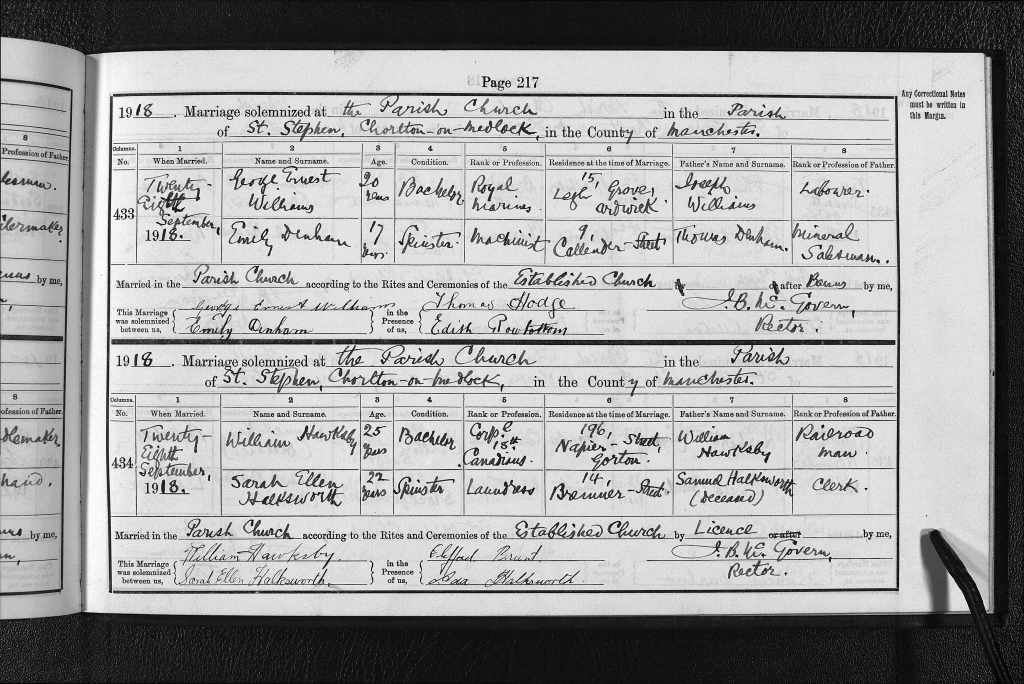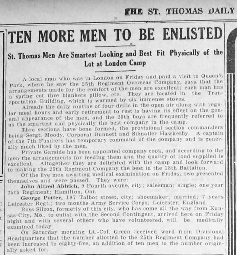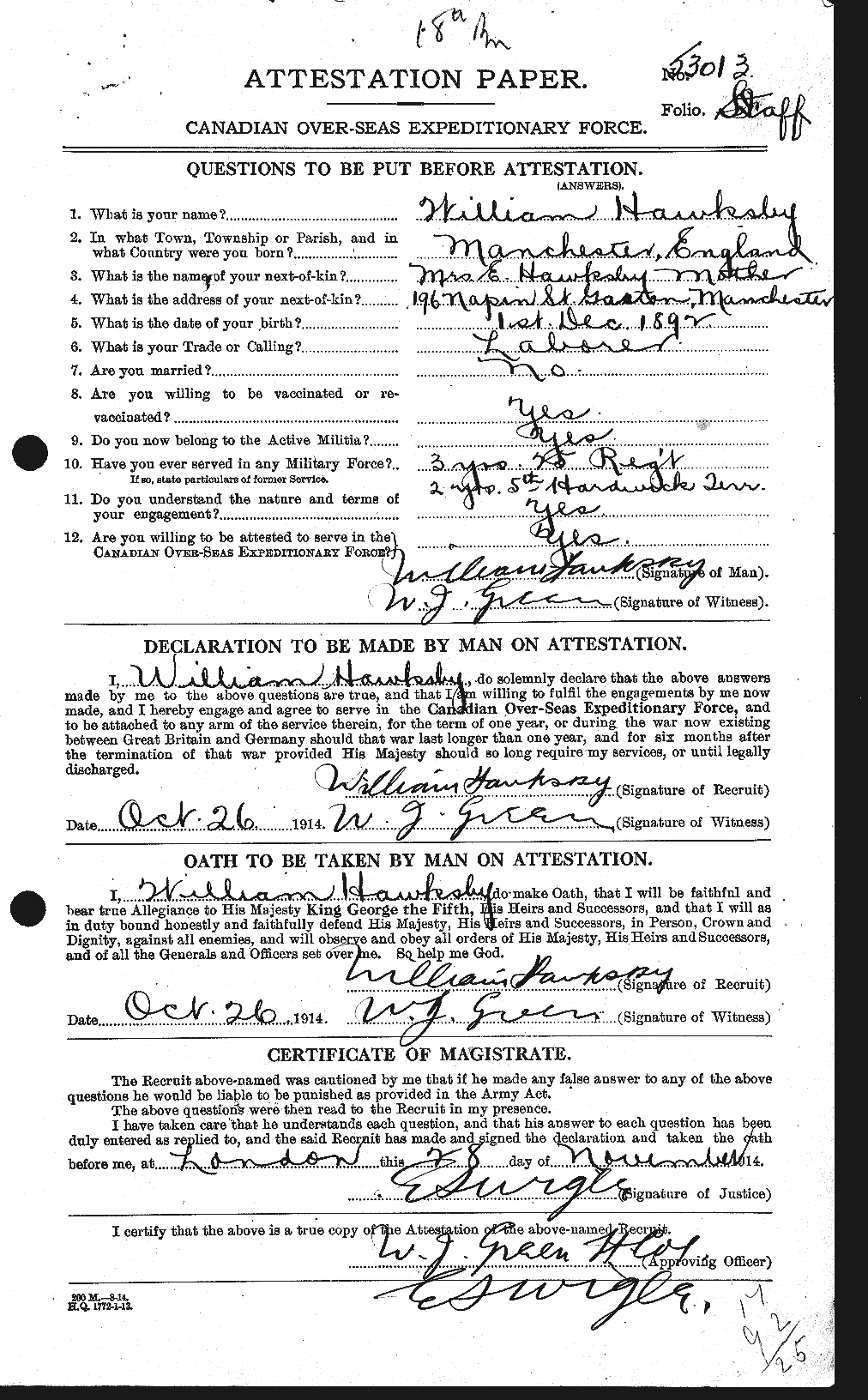 Family Search: When Private William Hawksby was born on 1 December 1892, in Gorton, Lancashire, England, United Kingdom, his father, William Hawksby, was 37 and his mother, Eliza Susannah Rawlins, was 37. He immigrated to Canada in 1913 and lived in Gorton, Manchester, Lancashire, England, United Kingdom in 1911 and Manchester, Lancashire, England, United Kingdom in 1921. He registered for military service in 1914. In 1914, at the age of 22, his occupation is listed as labourer in St. Thomas, Elgin, Ontario, Canada.