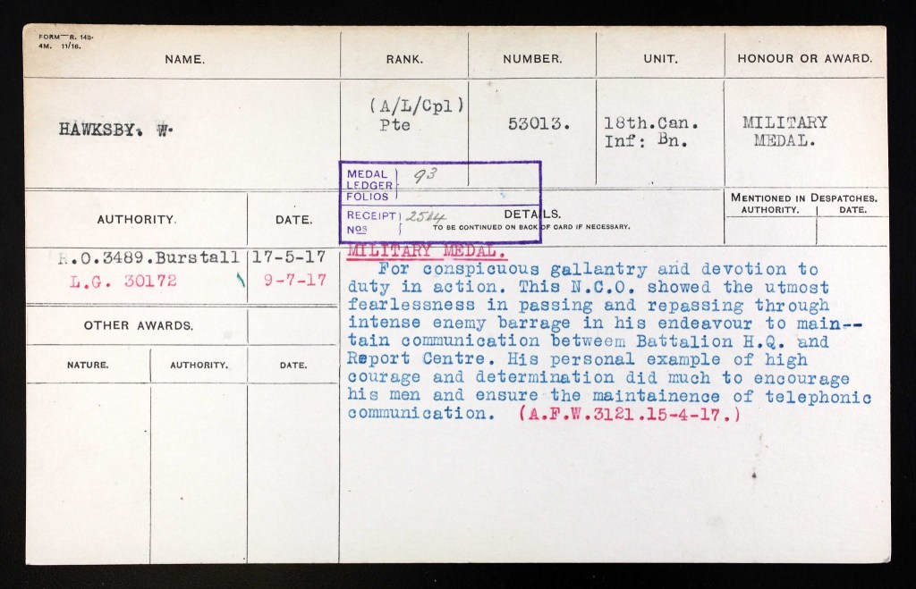 MILITARY MEDAL. For conspicuous gallantry and devotion to duty in action. This N.C.O. showed the utmost fearlessness in passing and repassing through intense enemy barrage in his endeavour to maintain communication between Battalion H.Q. and Report Centre. His personal example of high courage and determination did much to encourage his men and ensure the maintenance of telephonic communication. (A.F.W.3121.15-4-17.)