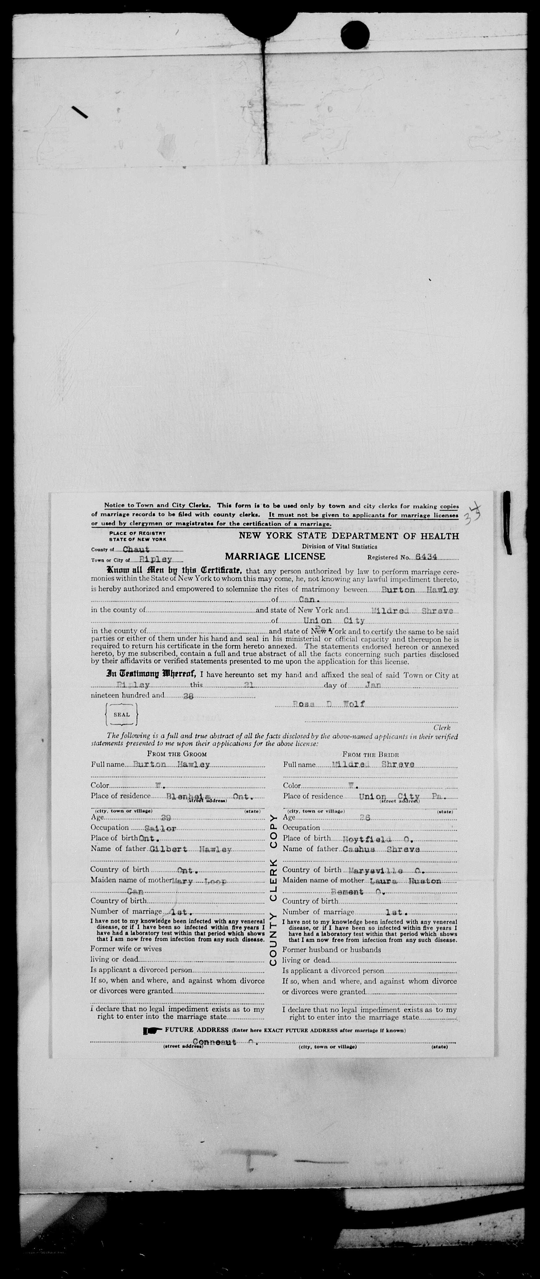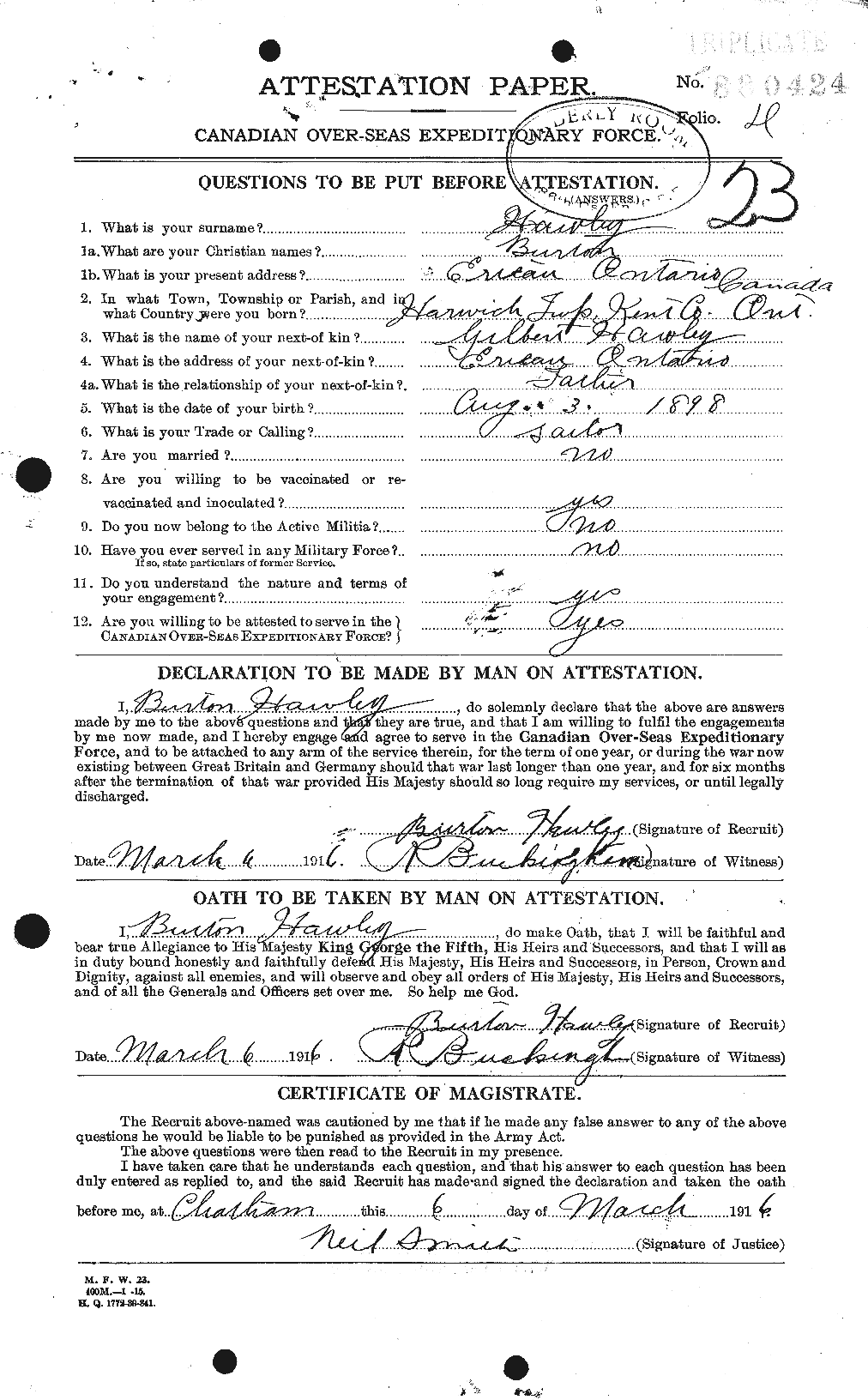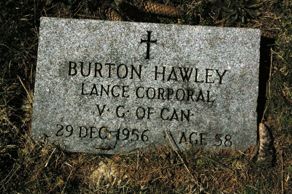 Family Search: When Private Burton Hawley was born on 3 August 1899, in Harwich, Kent, Ontario, Canada, his father, Gilbert Henry Hawley, was 28 and his mother, Mary Edna Loop, was 21. He married Mildred Shreve on 21 January 1928, in Chautauqua, New York, United States. They were the parents of at least 3 daughters. He lived in Uniontown, Fayette, Pennsylvania, United States in 1930 and Erieau, Kent, Ontario, Canada in 1931. He registered for military service in 1916. In 1931, at the age of 32, his occupation is listed as carpenter. He died on 29 December 1956, at the age of 57, and was buried in Blenheim, Chatham-Kent, Ontario, Canada.