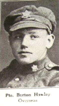 Family Search: When Private Burton Hawley was born on 3 August 1899, in Harwich, Kent, Ontario, Canada, his father, Gilbert Henry Hawley, was 28 and his mother, Mary Edna Loop, was 21. He married Mildred Shreve on 21 January 1928, in Chautauqua, New York, United States. They were the parents of at least 3 daughters. He lived in Uniontown, Fayette, Pennsylvania, United States in 1930 and Erieau, Kent, Ontario, Canada in 1931. He registered for military service in 1916. In 1931, at the age of 32, his occupation is listed as a carpenter in Erieau, Kent, Ontario, Canada. He died on 29 December 1956, at the age of 57, and was buried in Blenheim, Chatham-Kent, Ontario, Canada..