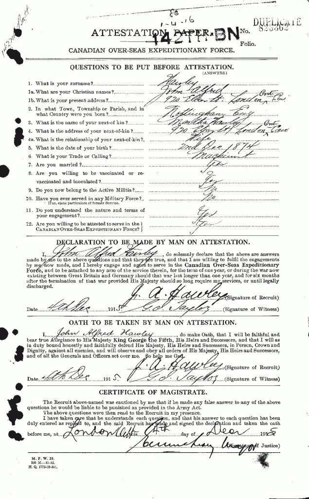 Family Search: John Alfred Hawley was born on 2 December 1870, in Nottinghamshire, England, United Kingdom. He had at least 1 son and 8 daughters with Martha Welborn. He lived in Nottingham, Nottinghamshire, England, United Kingdom in 1901 and London, Ontario, Canada in 1915. He registered for military service in 1915. In 1915, at the age of 45, his occupation is listed as machinist in London, Ontario, Canada. He died on 15 January 1939, at the age of 68.