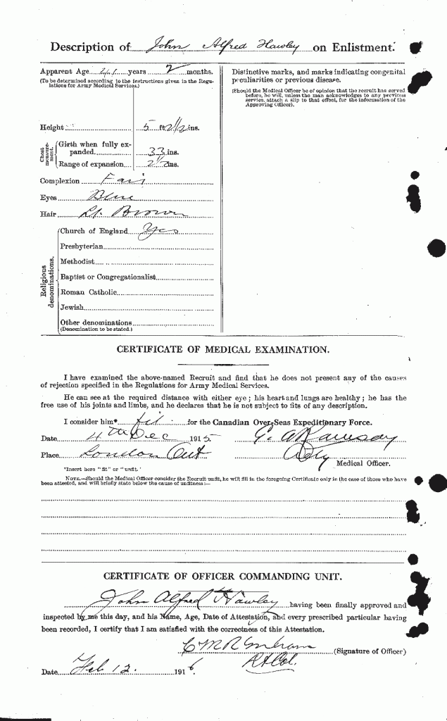 Source: Found while searching Veterans Death Cards for his son, John Alfred Hawley, reg. no. 823573. They served together in 142nd Battalion and this soldier served briefly with the 18th until being classified PB and re-assigned to other duties.