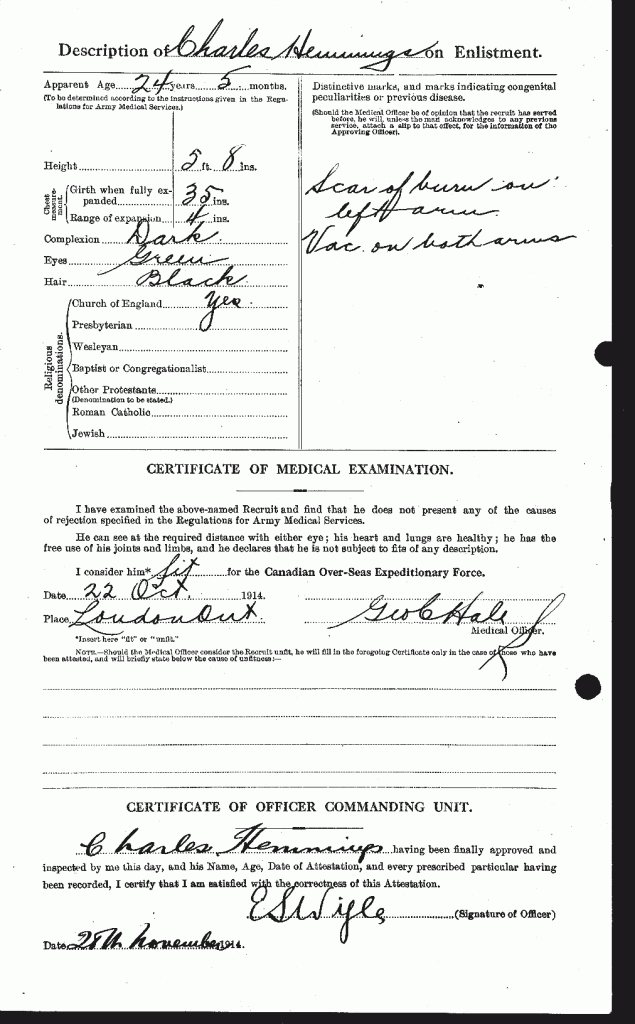 Hemmings, Charles: Service no. 53123 Digitized Service Record Source: 18th Battalion Nominal Roll, April 1915. Private Charlie Hemmings with his wife, Clara. Circa 1915. Thanks to Dawn Heuston for finding this snip of the image. Windsor Star. May 20, 1961. Via Annette Fulford, Twitter @avidgenie Source: Find-A-Grave. Photograph by Marty. Share this: Click to email a link to a friend (Opens in new window) Email Click to share on Facebook (Opens in new window) Facebook Click to share on X (Opens in new window) X Click to share on Reddit (Opens in new window) Reddit Click to share on LinkedIn (Opens in new window) LinkedIn Click to print (Opens in new window) Print Click to share on Tumblr (Opens in new window) Tumblr Click to share on Pocket (Opens in new window) Pocket Click to share on Pinterest (Opens in new window) Pinterest Click to share on Telegram (Opens in new window) Telegram Click to share on WhatsApp (Opens in new window) WhatsApp Like Loading...
