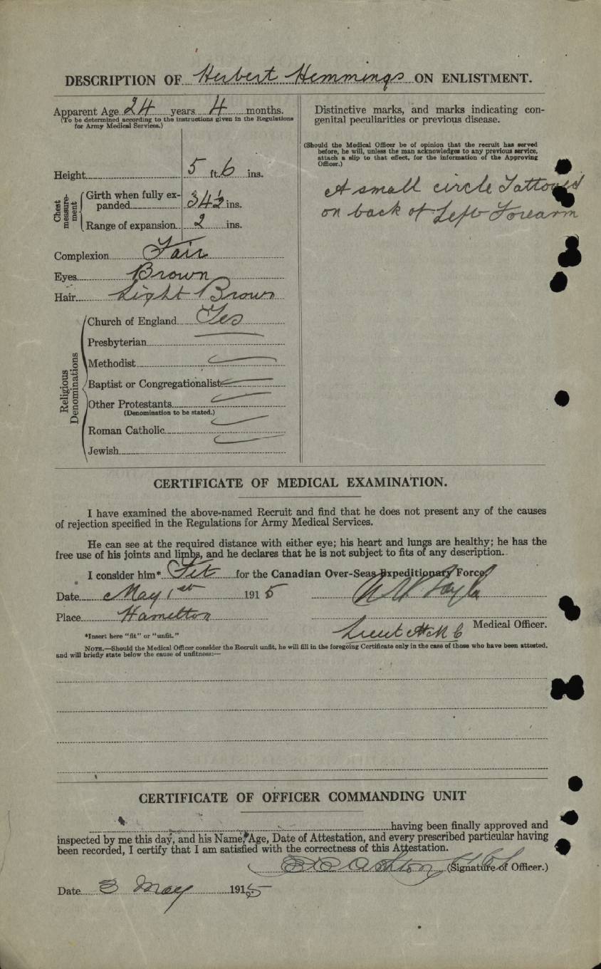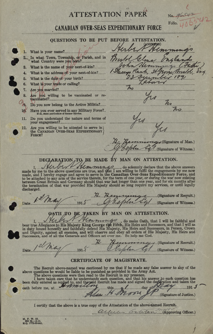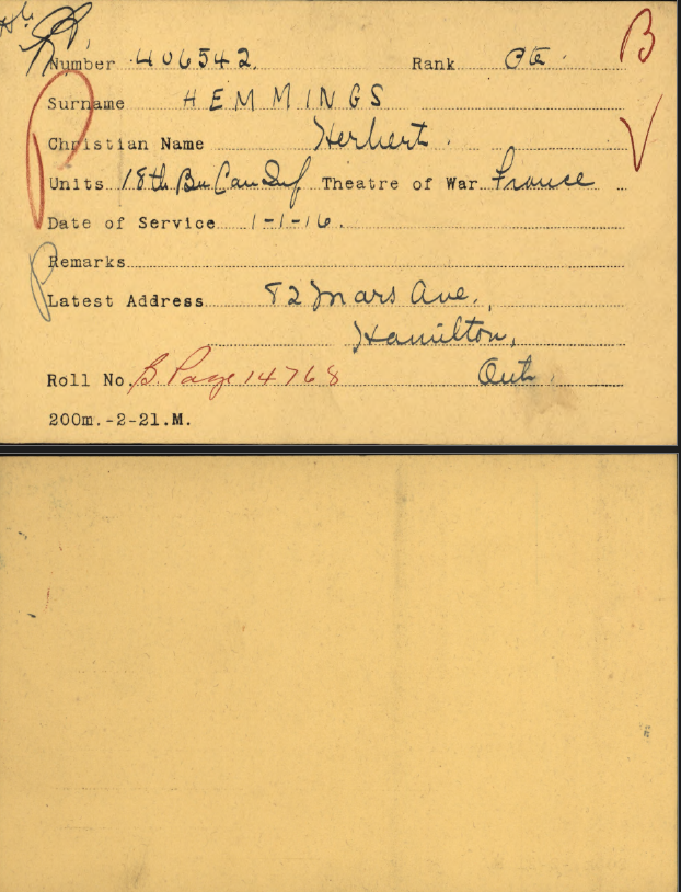 Family Search: When Private Herbert Hemmings was born on 23 December 1891, in Bristol, Gloucestershire, England, his father, John Hemmings, was 38 and his mother, Martha, was 42. He immigrated to Canada in 1913 and lived in Bristol, England, United Kingdom in 1901 and Hamilton, Wentworth, Ontario, Canada in 1921. He registered for military service in 1915. In 1915, at the age of 24, his occupation is listed as labourer in Hamilton, Wentworth, Ontario, Canada.