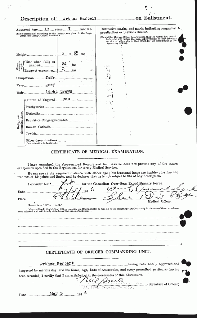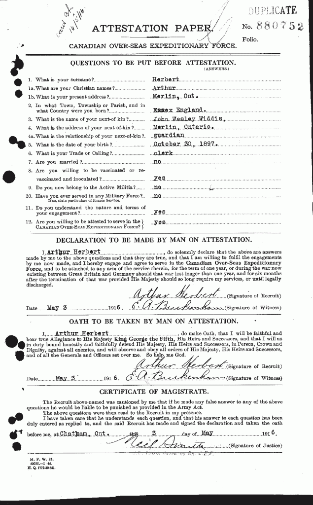 Herbert, Arthur: Service no. 880752 Digitized Service Record Source: Per post by Allan Miller at 18th Battalion Facebook Group. Find-A-Grave Gathering Our Heroes Share this: Click to email a link to a friend (Opens in new window) Email Click to share on Facebook (Opens in new window) Facebook Click to share on X (Opens in new window) X Click to share on Reddit (Opens in new window) Reddit Click to share on LinkedIn (Opens in new window) LinkedIn Click to print (Opens in new window) Print Click to share on Tumblr (Opens in new window) Tumblr Click to share on Pocket (Opens in new window) Pocket Click to share on Pinterest (Opens in new window) Pinterest Click to share on Telegram (Opens in new window) Telegram Click to share on WhatsApp (Opens in new window) WhatsApp Like Loading...