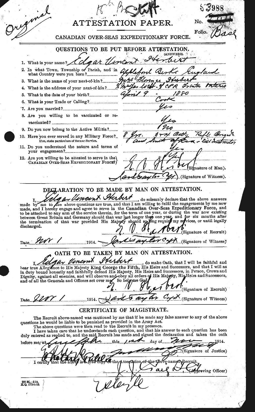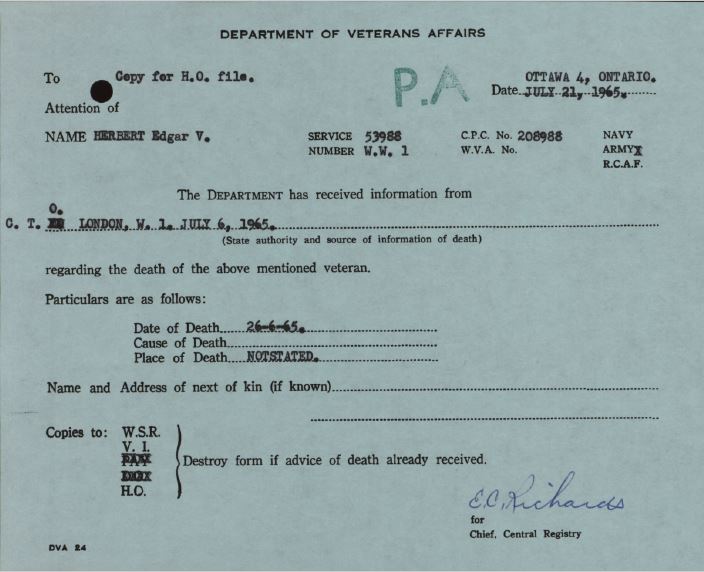 When in the latest casualty list the name of Sergt.-Major E.V. Herbert of the 18th Battalion appeared under the heading “Killed in Action,” there was no sorrowing wife or family in this country to be affected, but back of the three words there is a story of war’s toll, a story that has few equals in the wonderful annals of the present war.