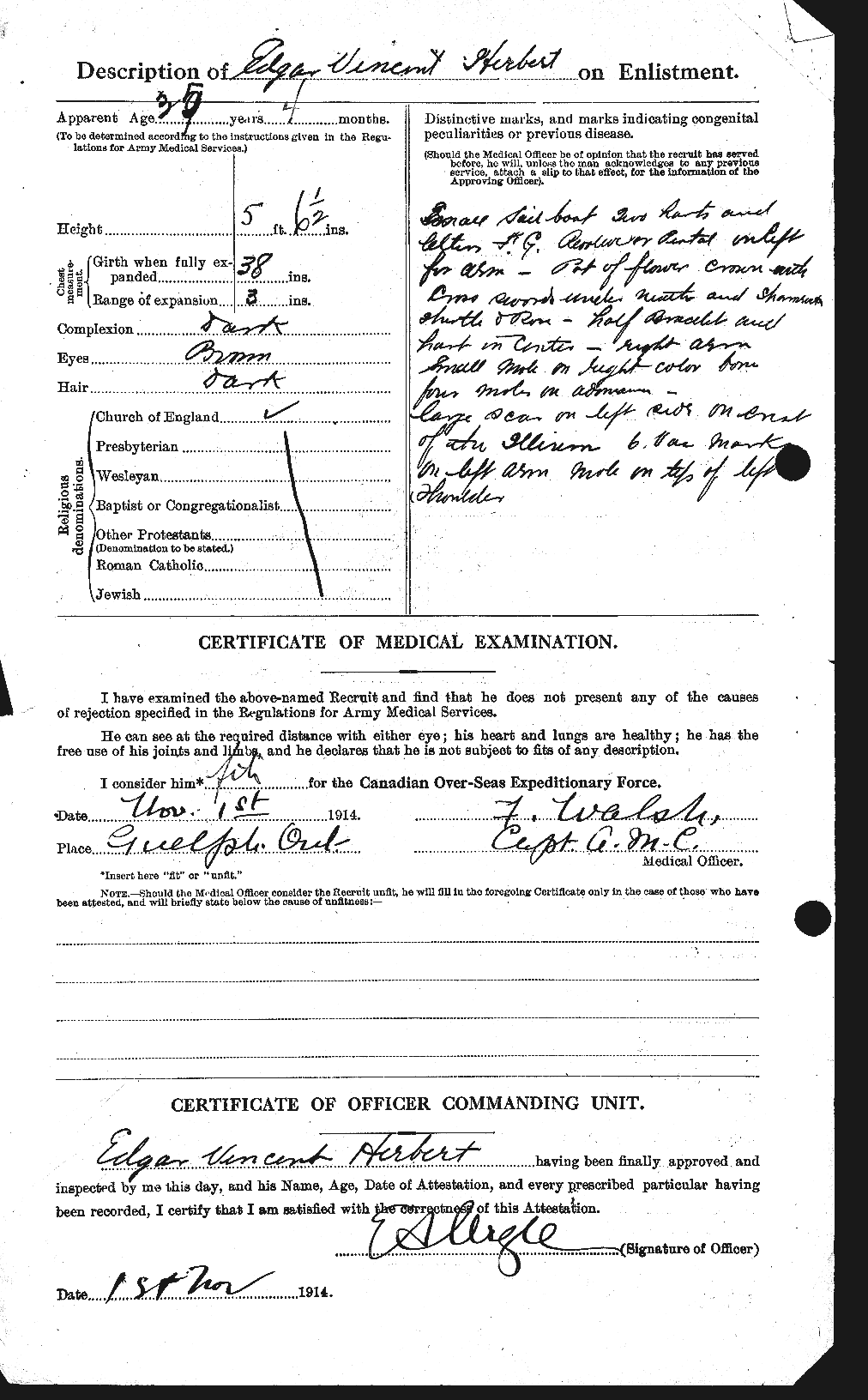 An old soldier of the imperial service, Sergt.-Major Herbert was employed as a chef at the Wellington Hotel, Guelph. His wife also was employed at the same institution. When war was declared the sergeant-major, with all the call of service pounding in his veins was anxious to again join the colors. Finally, securing his wife’s consent, he joined the 18th here, under Col. E.S. Wigle, and on the formation of the base company was made senior sergeant. His promotion to sergeant-major followed.
