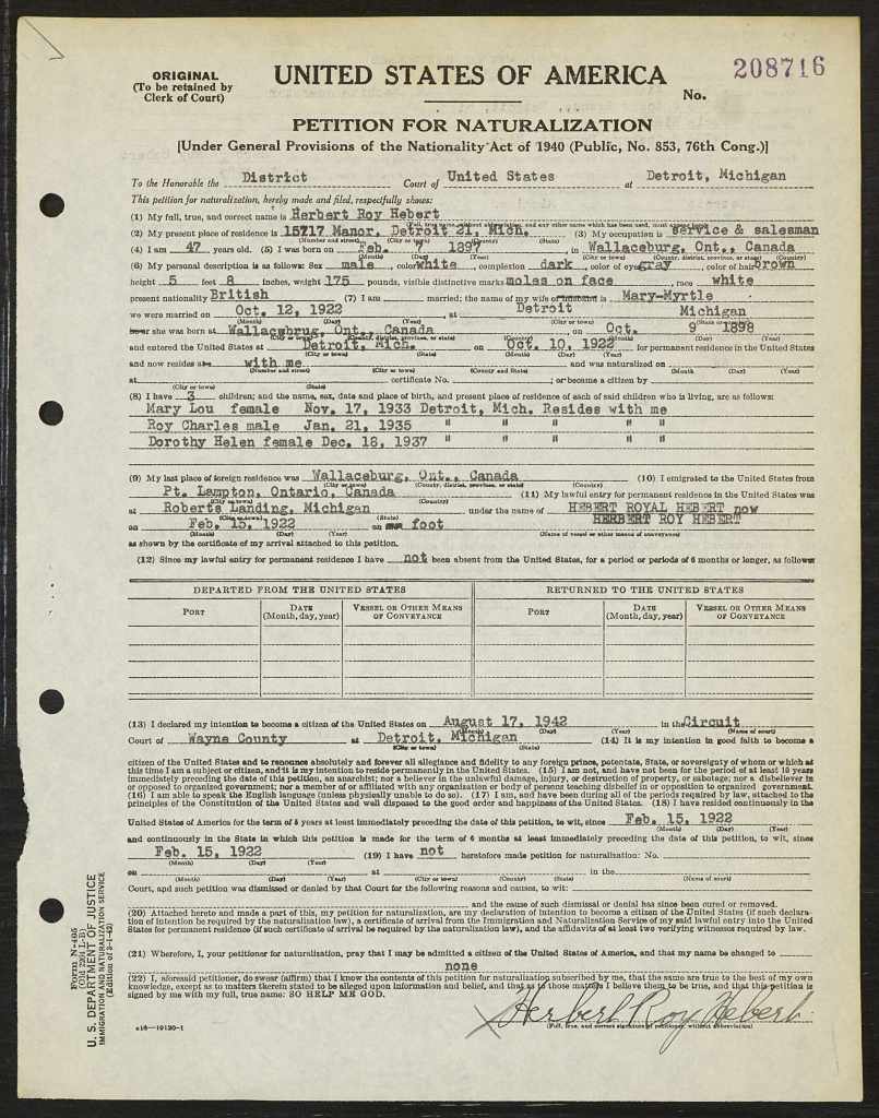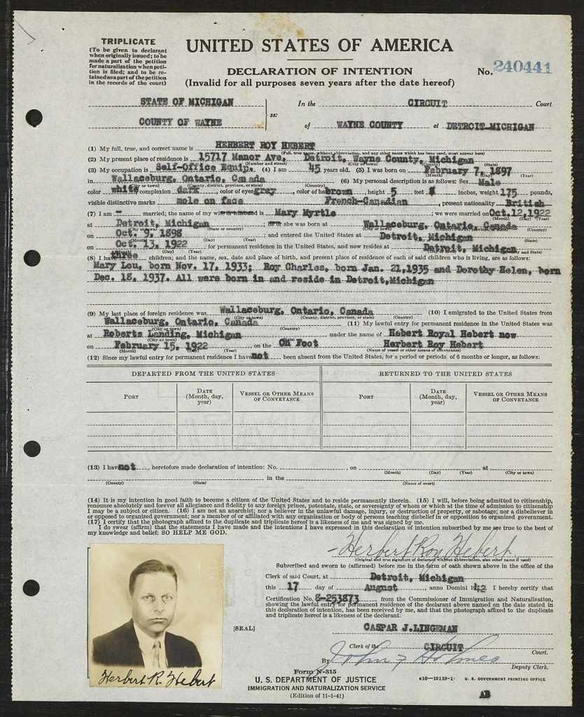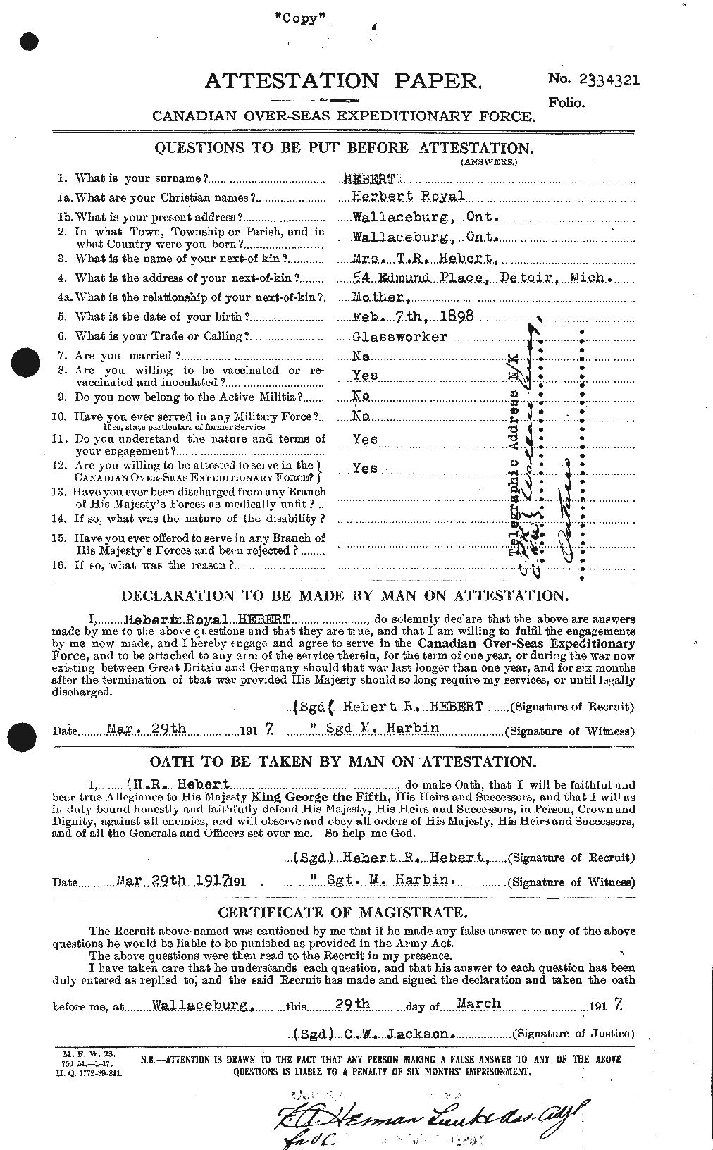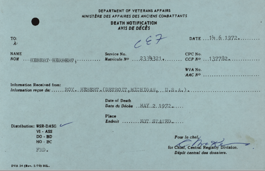 Family Search: When Private Herbert Royal Hebert was born on 7 February 1897, in Canada, his father, Gilbert Hébert, was 42 and his mother, Frédéline L. Lucier, was 38. He married Mary Myrtle Johnston on 12 October 1922, in Detroit, Wayne, Michigan, United States. They were the parents of at least 1 son and 2 daughters. He immigrated to Vermont, United States in 1916 and lived in United States in 1949 and Detroit, Wayne, Michigan, United States in 1950. He died on 2 May 1972, at the age of 75.