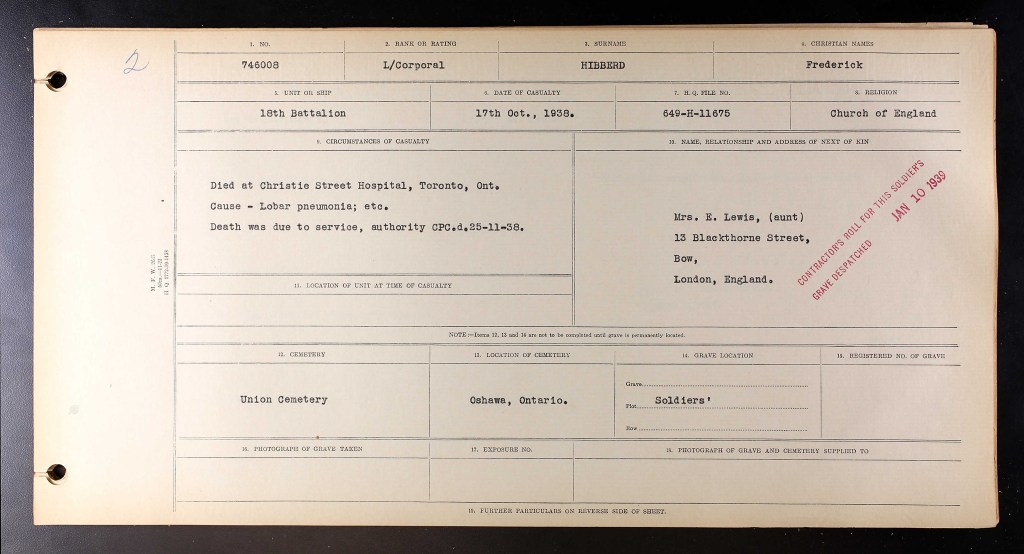 | October 17, 1938 | Deceased | Private Hibberd dies of lobar pneumonia at the Christie Street Hospital, Toronto, Ontario. His death was caused by his service with the CEF. He is buried at Oshawa Union Cemetery, Oshawa, Ontario. He was 56-years old. |