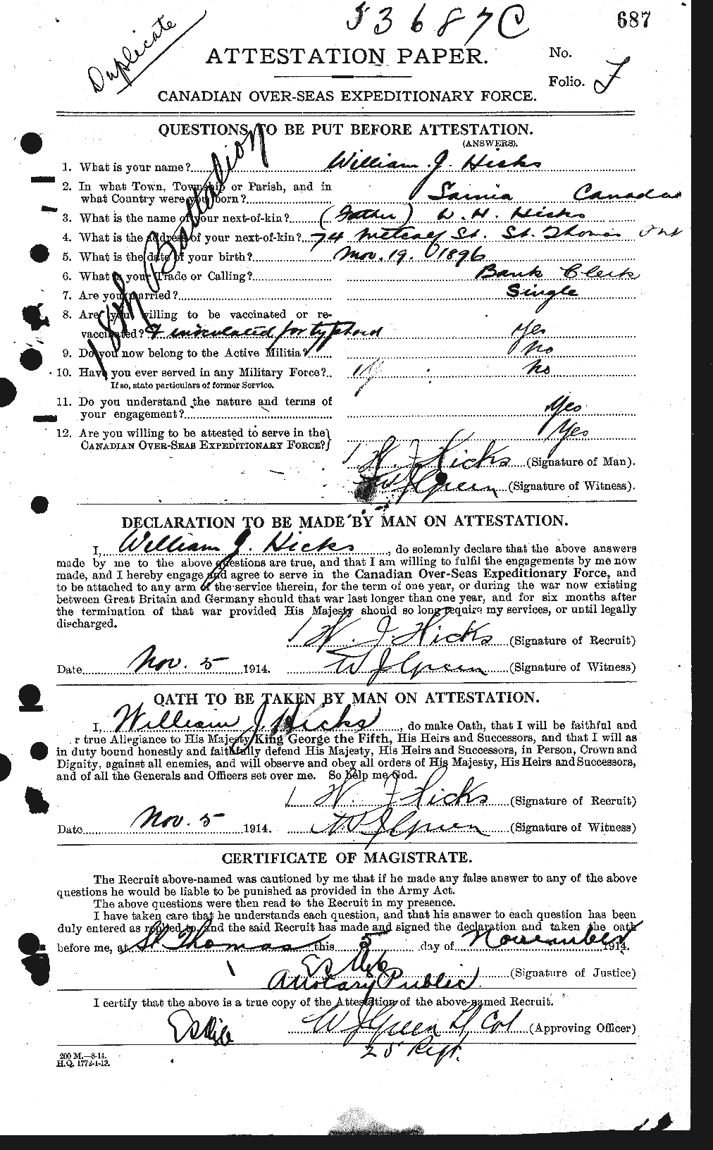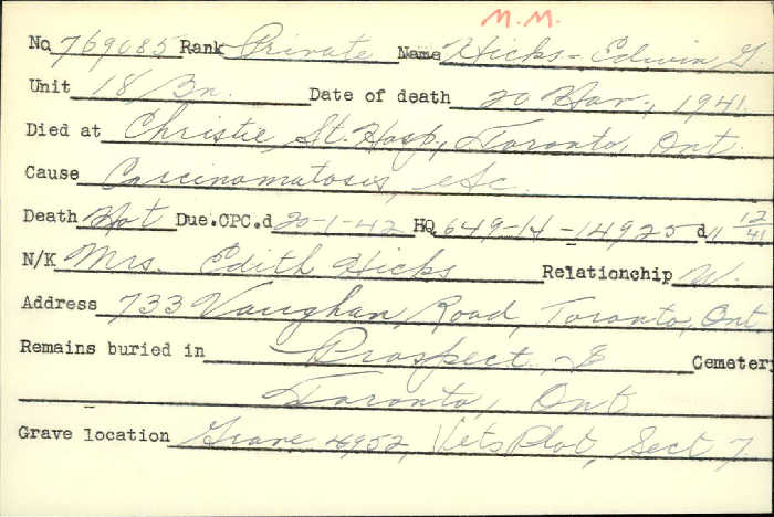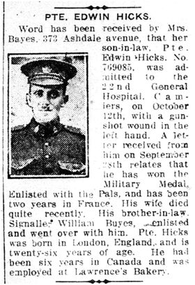 Hicks, Edwin George: Service no. 769085 Digitized Service Record Source: Per news clipping post by David Archer at 18th Battalion Facebook Page (not group). Find-A-Grave Hicks, Edwin George: Service no. 769085. Source: Toronto Telegram. October 1918. Per news clipping post by David Archer at 18th Battalion Facebook Page (not group). Share this: Click to email a link to a friend (Opens in new window) Email Click to share on Facebook (Opens in new window) Facebook Click to share on X (Opens in new window) X Click to share on Reddit (Opens in new window) Reddit Click to share on LinkedIn (Opens in new window) LinkedIn Click to print (Opens in new window) Print Click to share on Tumblr (Opens in new window) Tumblr Click to share on Pocket (Opens in new window) Pocket Click to share on Pinterest (Opens in new window) Pinterest Click to share on Telegram (Opens in new window) Telegram Click to share on WhatsApp (Opens in new window) WhatsApp Like Loading...