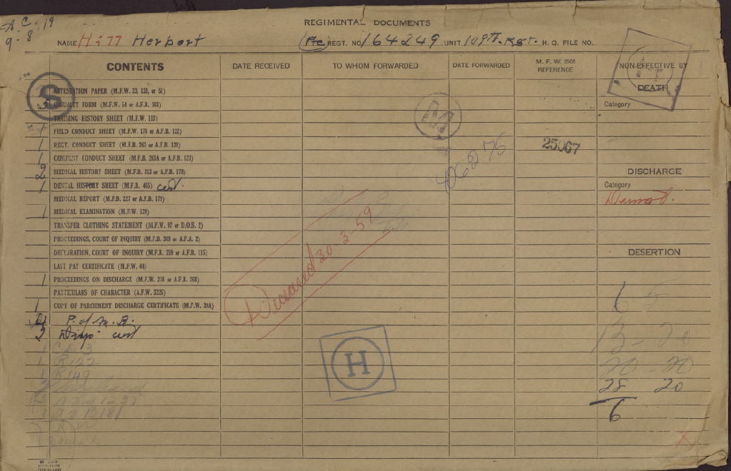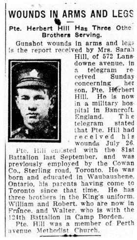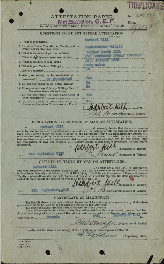 Family Search: Herbert Hill was born on 25 January 1892, in Waubaushene, Tay, Simcoe, Ontario, Canada as the son of Sarah Hill. He had at least 4 sons and 1 daughter with Kathleen Droy. He registered for military service in 1915. In 1915, at the age of 23, his occupation is listed as candymaker in Toronto, York, Ontario, Canada. He died on 30 March 1959, in Toronto, York, Ontario, Canada, at the age of 67, and was buried in York Cemetery, Toronto, Ontario, Canada.