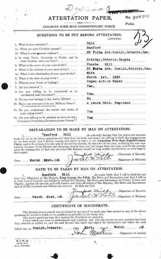 “Trade listed as Organ Action Maker. DOB 1-3-80, born Grimsby, Ontario. 5 foot 6 3/4 inches. Blue eyes, brown hair. Methodist. Mary Hill, mother. NOK Phoebe Hill, wife. Enlisted Guelph 21-3-16 (age 36 years), lists 4 years service in 30th Wellington Regiment. Not found on 153rd Nominal Roll published Guelph Mercury 10-6-16. On 153rd Battalion Nominal Roll as published Guelph Mercury 1-12-16. Embarked with 153rd Halifax N.S. Olympic 29-4-17. Arrived Liverpool 7-5-17. Assigned 25th Reserve for Training and Administration. Taken on Strength 18th Battalion 29-3-18. Returned to Canada aboard SS Caronia, sailed from Liverpool 14-5-19. Demobilized London, 24-5-19. Ontario Marriage Registry (01820) married Phoebe Ann Calvert 28-10-10 at Nassagaweya, Halton, Ontario. Died 1968 buried Woodlawn Cemetery Guelph, records Block U. Photo: courtesy Find a Grave.