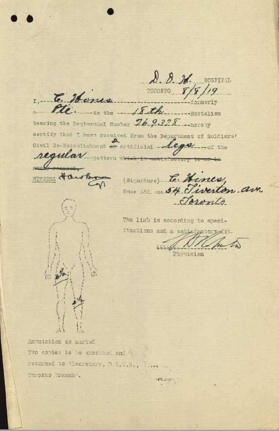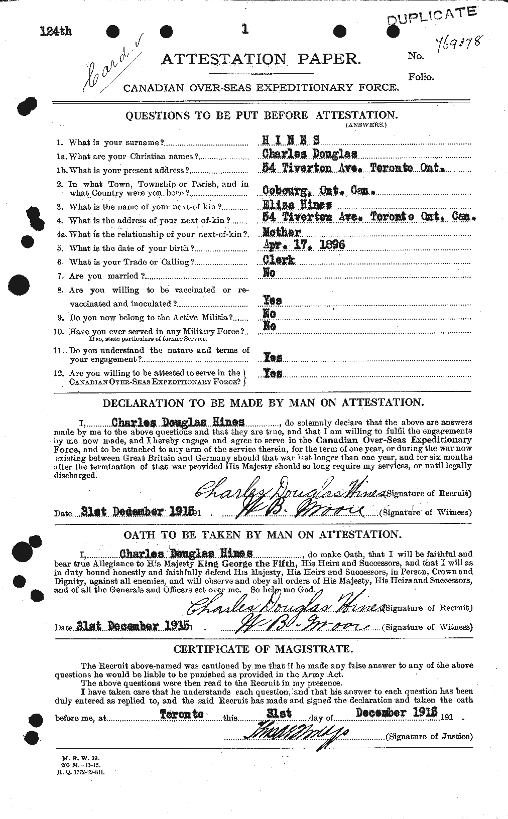 HINES, Charles Douglas (18th Battalion W. W. I, Life member War Amd. Association of Canada)