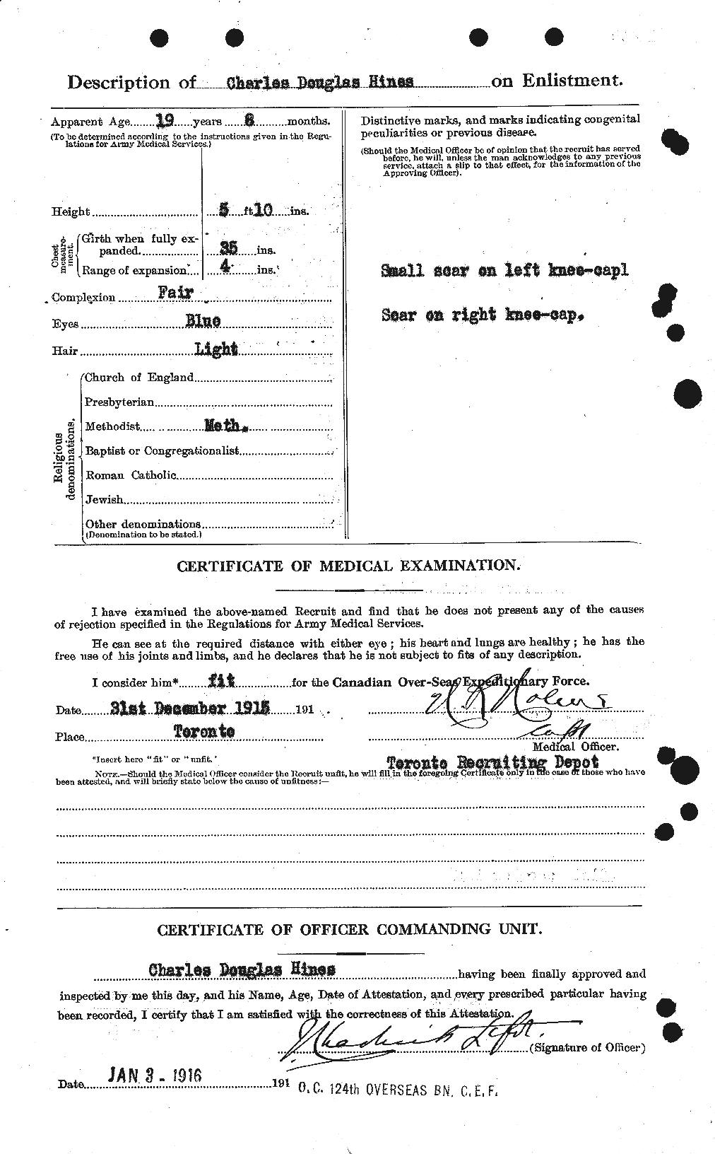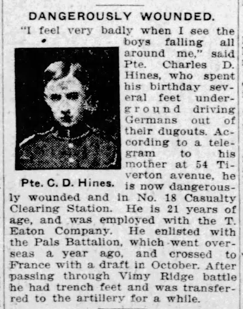 Family Search: When Private Charles Douglas Hines was born on 17 April 1896, in Cobourg, Northumberland, Ontario, Canada, his father, Frederick George Hines, was 40 and his mother, Eliza Jane McGlennon, was 35. He married Margaret Maud Law on 18 January 1919, in York, Toronto, Ontario, Canada. They were the parents of at least 1 son. He immigrated to Vermont, United States in 1920 and lived in Scarborough, Toronto, Ontario, Canada in 1931. He registered for military service in 1915. In 1915, at the age of 19, his occupation is listed as clerk. He died on 25 August 1971, in Toronto, Ontario, Canada, at the age of 75, and was buried in Pine Hills Cemetery, Scarborough, Toronto, Ontario, Canada.