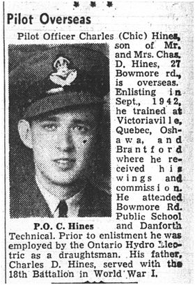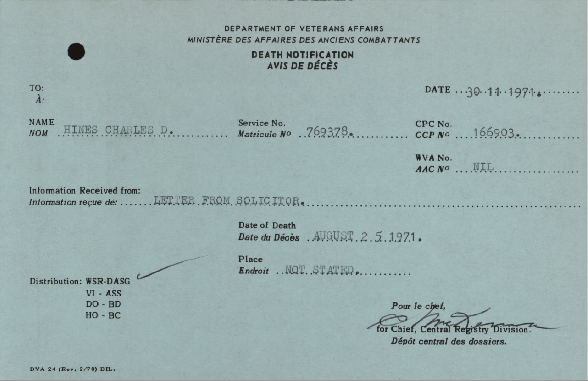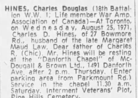 At Toronto, on Wednesday, August 25, 1971, Charles D. Hines, of 27 Bowmore Rd., husband of the late Margaret Maud Law. Dear father of Charles R. (Chic). Mr. Hines will be resting at the “Danforth Chapel” of McDougall & Brown Ltd., 1491 Danforth Ave. after 2 p.m. Thursday. (Enter parking area from Parkmount Rd.) Service in the chapel 11:30 a.m. Saturday. Interment Veterans’ Plot, Pine Hills Cemetery.