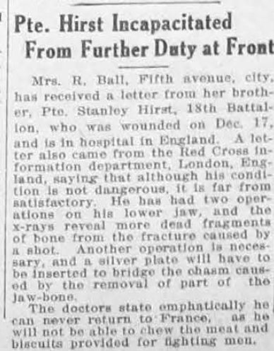 Family Search: When Private Stanley Hirst was born on 24 December 1892, in Southampton, Hampshire, England, United Kingdom, his father, William Thomas Hirst, was 43 and his mother, Eliza Jane Dymott, was 41. He married Doris May Sutton on 5 August 1928, in Windsor, Sandwich Township, Essex, Ontario, Canada. He immigrated to Canada in 1914 and lived in Slough, Buckinghamshire, England, United Kingdom in 1939 and Toronto, York, Ontario, Canada in 1951. He registered for military service in 1914. In 1951, at the age of 59, his occupation is listed as toolmaker in Toronto, York, Ontario, Canada.
