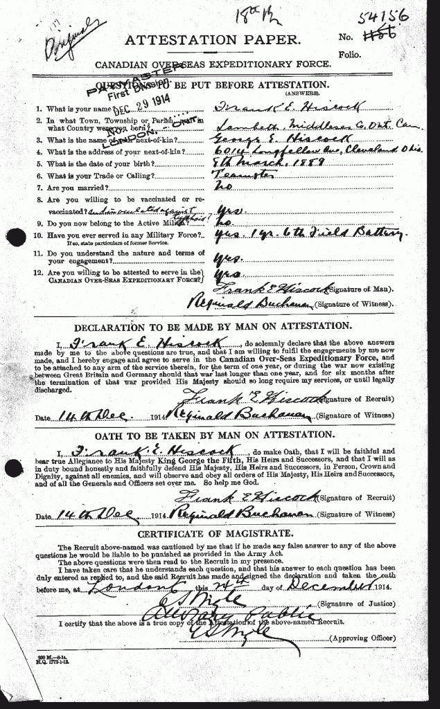 Hiscock, Frank Ernest: Service no. 54156 Digitized Service Record Source: 18th Battalion Nominal Roll, April 1915. Find-A-Grave Source: Operation Picture Me via The 18th Battalion Facebook Group. London Free Press Circa 1917. Share this: Click to email a link to a friend (Opens in new window) Email Click to share on Facebook (Opens in new window) Facebook Click to share on X (Opens in new window) X Click to share on Reddit (Opens in new window) Reddit Click to share on LinkedIn (Opens in new window) LinkedIn Click to print (Opens in new window) Print Click to share on Tumblr (Opens in new window) Tumblr Click to share on Pocket (Opens in new window) Pocket Click to share on Pinterest (Opens in new window) Pinterest Click to share on Telegram (Opens in new window) Telegram Click to share on WhatsApp (Opens in new window) WhatsApp Like Loading...
