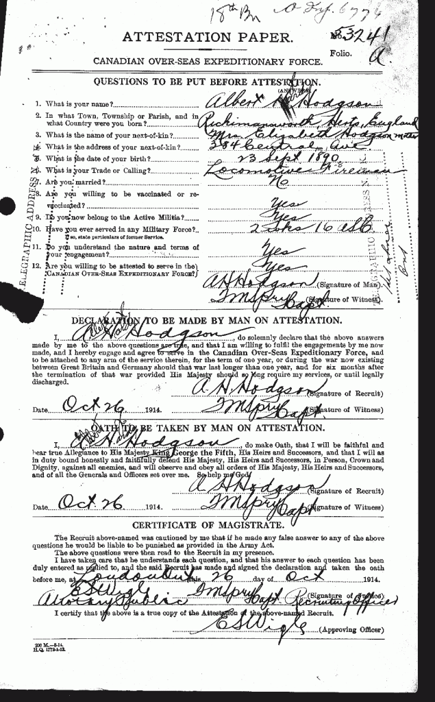 Hodgson, Albert Hardy: Service no. 53241 Digitized Service Record Source: 18th Battalion Nominal Roll, April 1915. Find-A-Grave Source: Find-A-Grave. Photograph by BShea. Share this: Click to email a link to a friend (Opens in new window) Email Click to share on Facebook (Opens in new window) Facebook Click to share on X (Opens in new window) X Click to share on Reddit (Opens in new window) Reddit Click to share on LinkedIn (Opens in new window) LinkedIn Click to print (Opens in new window) Print Click to share on Tumblr (Opens in new window) Tumblr Click to share on Pocket (Opens in new window) Pocket Click to share on Pinterest (Opens in new window) Pinterest Click to share on Telegram (Opens in new window) Telegram Click to share on WhatsApp (Opens in new window) WhatsApp Like Loading...