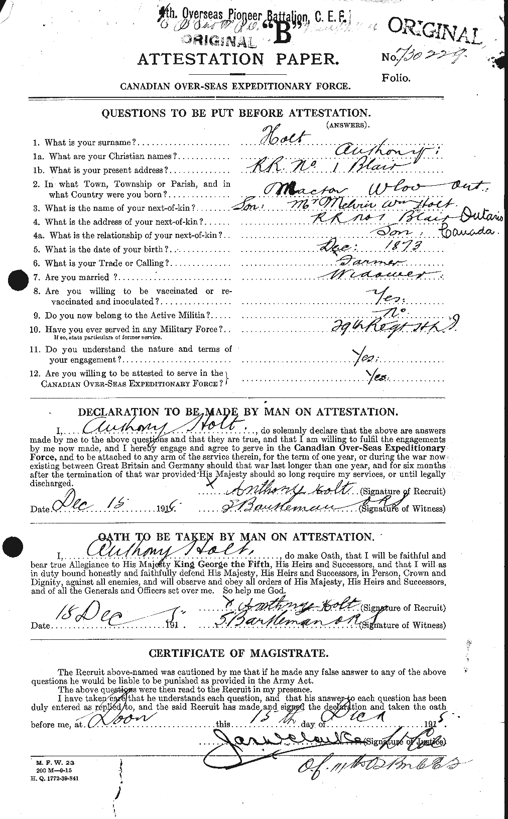 Prior to enlisting he served in the 29th Regiment. Anthony enlisted in Doon on December 15, 1915. His address at the time of enlistment was R.R. #1, Blair, Ontario and his next of kin was his son, Melvin, of the same address. He was a widower. Farmer was given as his occupation.
