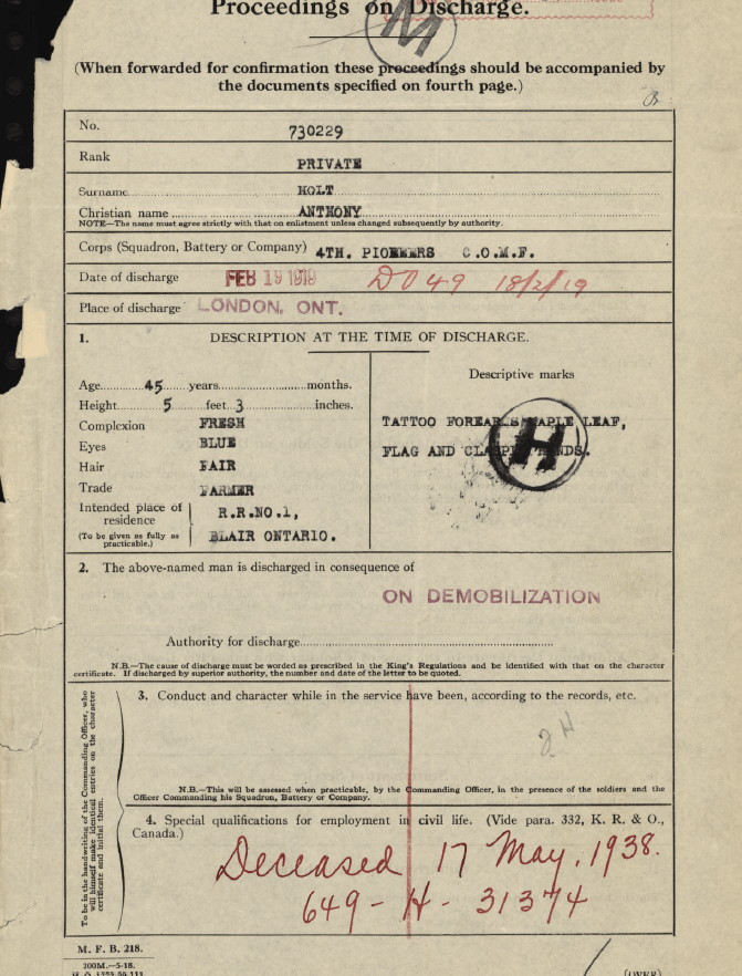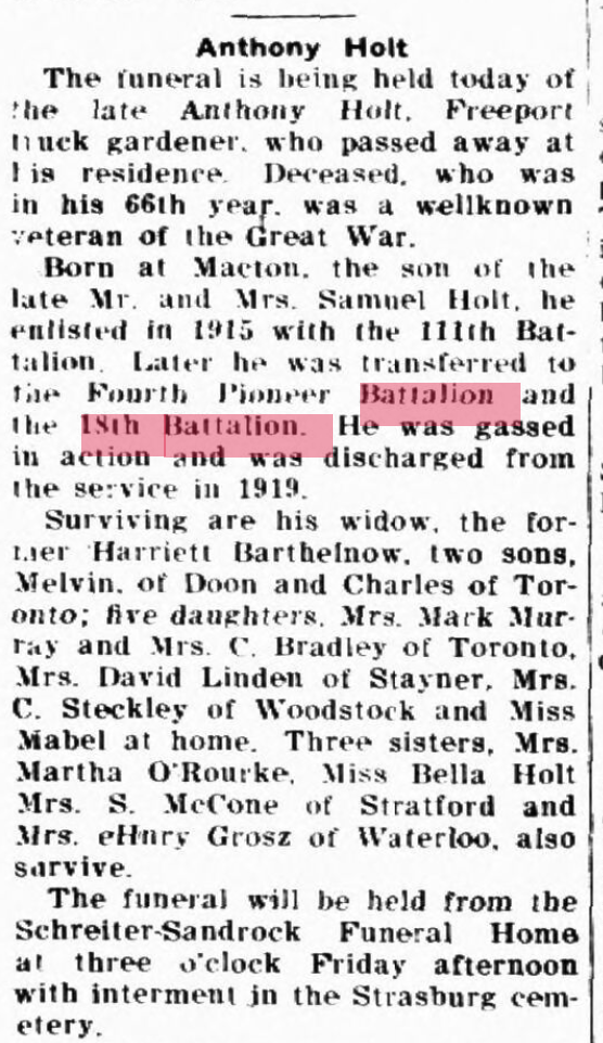 Family Search: When Private Anthony Holt was born on 20 December 1873, in Wellesley Township, Waterloo, Ontario, Canada, his father, Samuel Holt, was 49 and his mother, Arabella Haney, was 27. He married Mary Ann Siebert on 26 October 1897, in Berlin, Waterloo, Ontario, Canada. They were the parents of at least 2 sons and 4 daughters. He lived in Washburn, Bayfield, Wisconsin, United States in 1920 and Kitchener, Waterloo, Ontario, Canada in 1922. He registered for military service in 1915. In 1915, at the age of 42, his occupation is listed as farmer in Blair, Waterloo, Ontario, Canada. He died on 17 May 1938, in Waterloo, Ontario, Canada, at the age of 64, and was buried in Pioneer Park Mennonite Cemetery, Kitchener, Waterloo, Ontario, Canada.