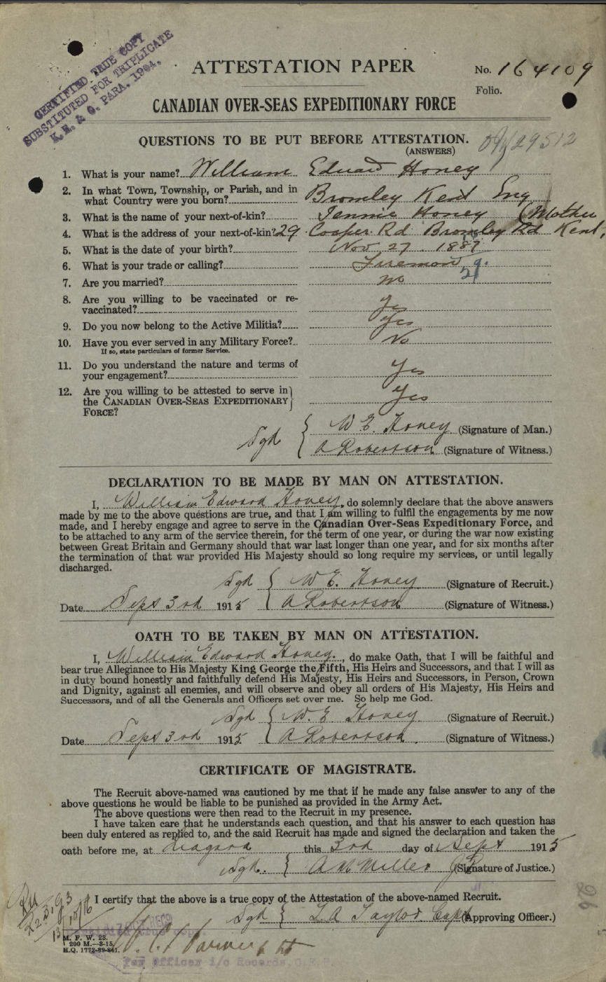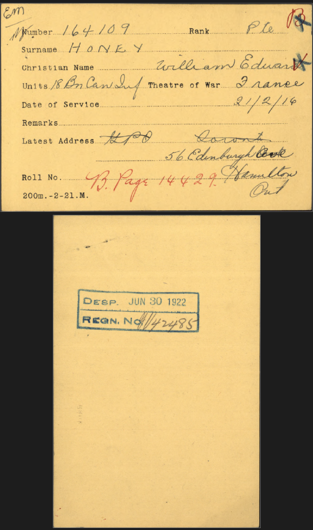 Family Search: When Private William Edward Honey was born on 27 November 1887, in Bromley, London, England, United Kingdom, his father, William Honey, was 27 and his mother, Jane, was 22. He lived in Bromley, Kent, England, United Kingdom for about 10 years. He registered for military service in 1915. In 1920, his occupation is listed as Procter and Gamble in Hamilton, Wentworth, Ontario, Canada. He died on 27 March 1967, in Hamilton, Wentworth, Ontario, Canada, at the age of 79, and was buried in White Chapel Memorial Gardens, Hamilton, Ontario, Canada.
