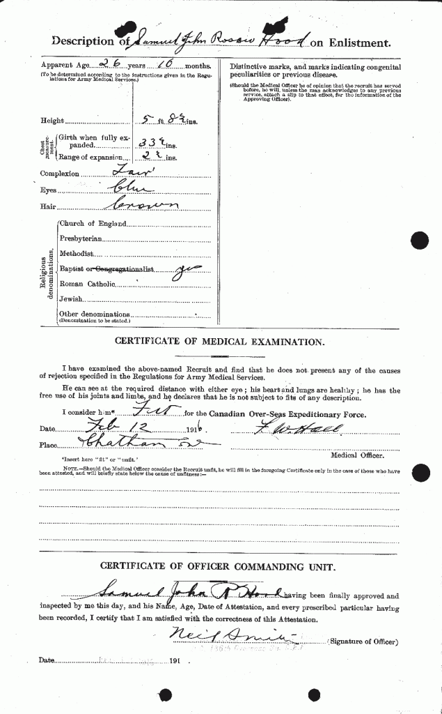 Family Search: When Samuel John Rossco Hood was born on 27 April 1889, in Chatham, Kent, Ontario, Canada, his father, John A Hood, was 38 and his mother, Louise Coole, was 32. He registered for military service in 1916. In 1916, at the age of 27, his occupation is listed as moulder in Chatham, Kent, Ontario, Canada. He died on 28 April 1948, in Chatham, Kent, Ontario, Canada, at the age of 59, and was buried in Maple Leaf Cemetery, Chatham, Chatham-Kent, Ontario, Canada.