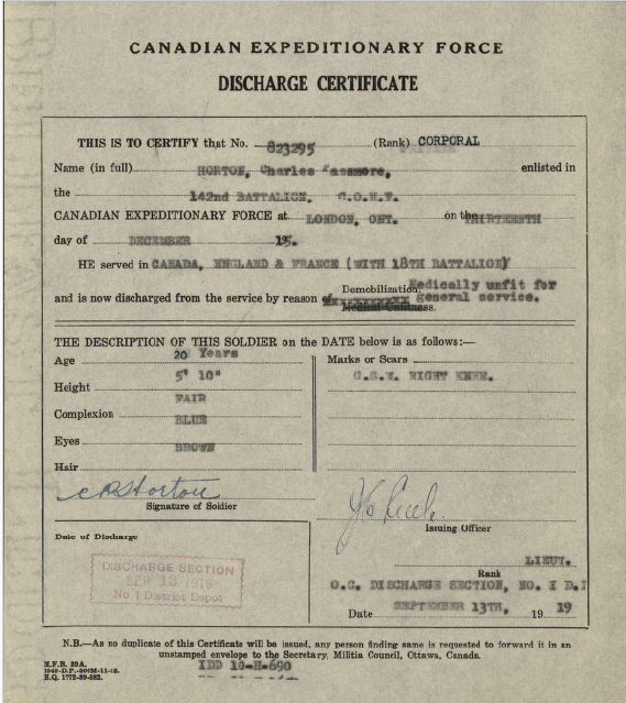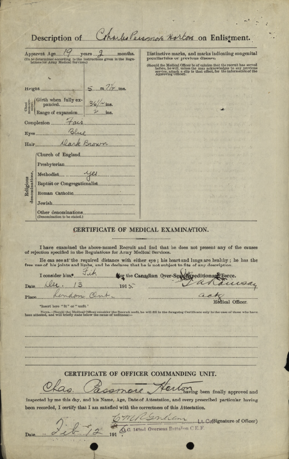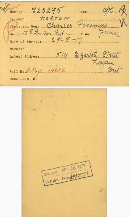 Family Search: When Sergeant Charles Passmore Horton was born on 4 October 1898, in London, Ontario, Canada, his father, Alfred Horton, was 36 and his mother, Elizabeth Graham, was 30. He had at least 2 daughters with Anita Margaret Graham. He lived in Middlesex, Ontario, Canada in 1901 and Malahide Township, Elgin, Ontario, Canada in 1931. He registered for military service in 1915. In 1931, at the age of 33, his occupation is listed as farmer. He died on 9 April 1963, in Aylmer, Elgin, Ontario, Canada, at the age of 64, and was buried in Aylmer Cemetery, Aylmer, Elgin, Ontario, Canada.