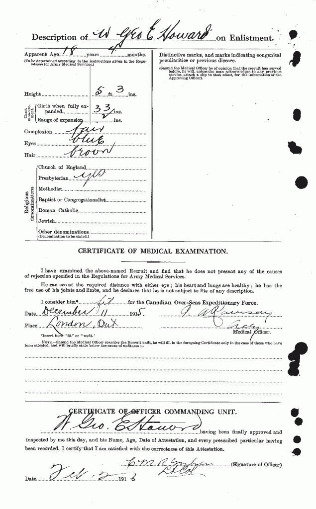 Enlisted 10 December 1915 at London, Ontario with the 142nd Battalion.