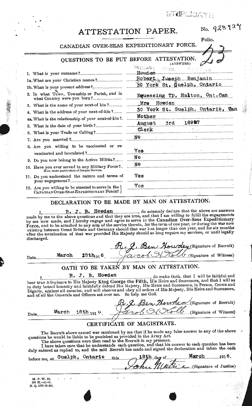 Family Search: When Robert Joseph Benjamin Howden was born on 3 August 1900, in Ontario, Canada, his father, Benjamin F. Howden, was 34 and his mother, Margaret Trimble, was 25. He lived in Wellington, Ontario, Canada in 1911. He registered for military service in 1916. In 1916, at the age of 16, his occupation is listed as clerk in Guelph, Wellington, Ontario, Canada. He died on 15 April 1924, in Guelph, Wellington, Ontario, Canada, at the age of 23, and was buried in Guelph, Wellington, Ontario, Canada.