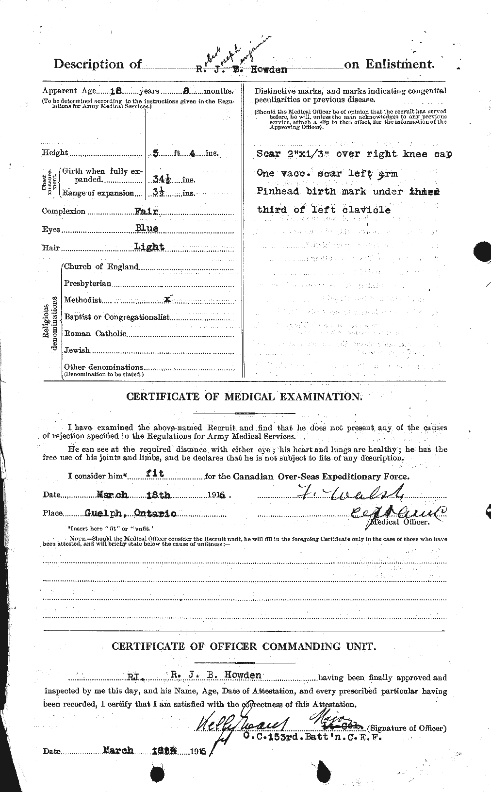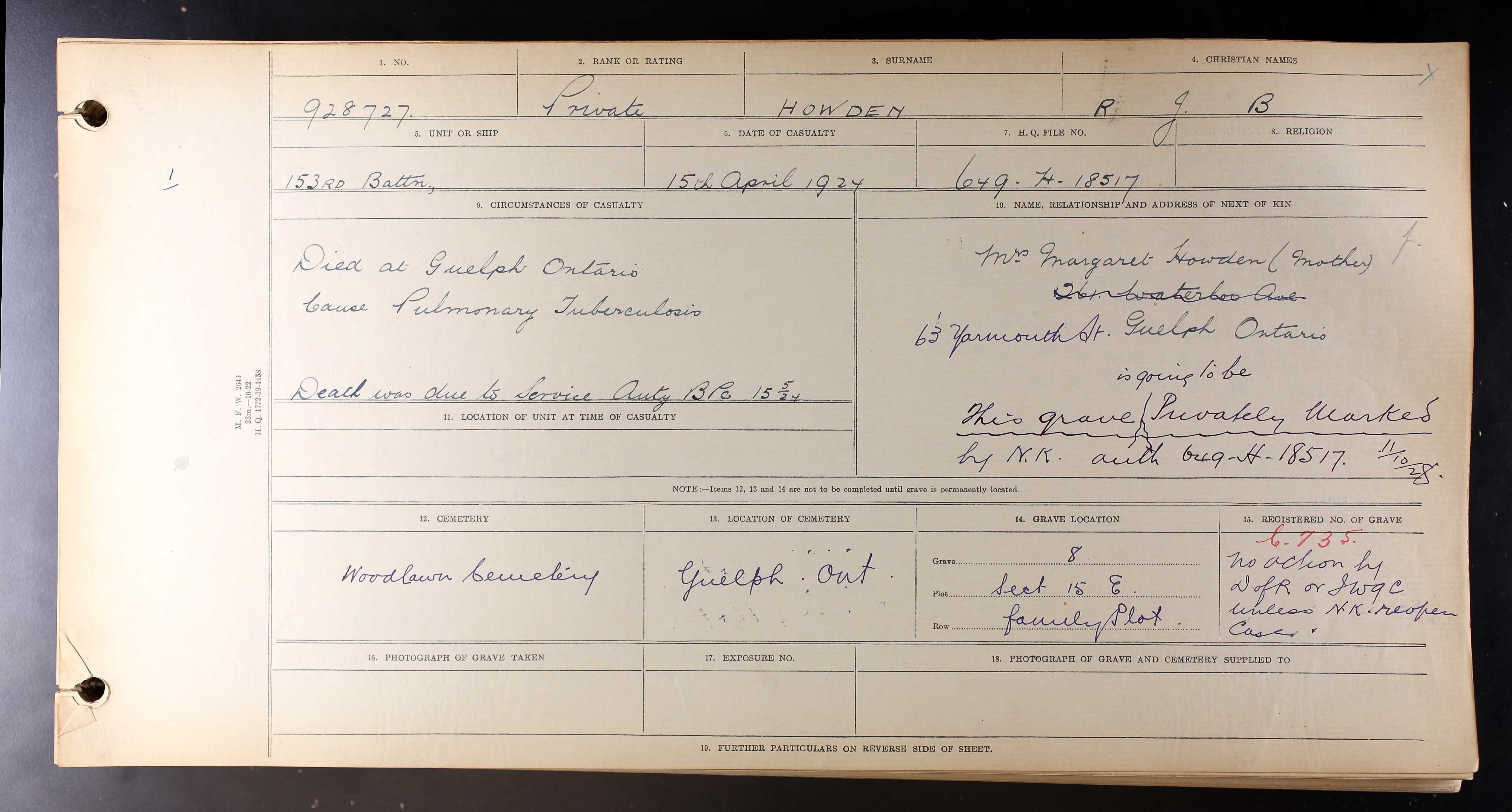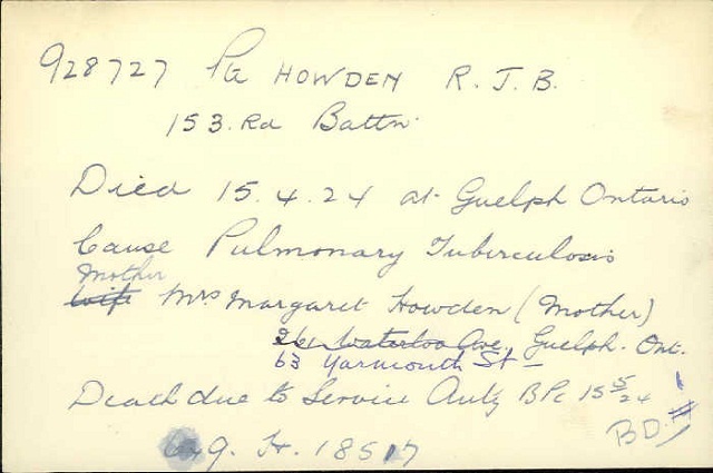 Trade listed as Clerk. DOB 3-8-97, born Equessing Township, Halton, Ontario. 5 foot 4 inches. Blue eyes, light hair. Methodist. NOK Margaret Howden, Mother. Benjamin Howden, father. Enlisted Guelph 18-3-16 (age 18 years 8 months). On 153rd Nominal Roll 1-4-16, no transfer noted. On 153rd Nominal Rolls as published Guelph Mercury 10-6-16 and 1-12-16. Embarked with 153rd Halifax N.S. SS Olympic 29-4-17. Arrived Liverpool 7-5-17. Assigned 25th Reserve for Training and Administration. Taken on Strength 18th Battalion 29-3-18. GSW 23-8-18, left thigh. Globe & Mail Canadian Casualty lists 29-8-18 under ‘Infantry’ reports wounded. Returned to Canada aboard SS Caronia, 22-5-19. Demobilized London 24-5-19. Ontario Death Records (033625) notes death 15-4-24, pulmonary tuberculosis. Veterans Death Card: death due to war service. Woodlawn Cemetery records Guelph, buried Block U Sec 18 Lot 19 Grave 1. NOK Benjamin Howden, father. Birthdate on record 3-8-00, if correct lied about age to serve in 153rd.