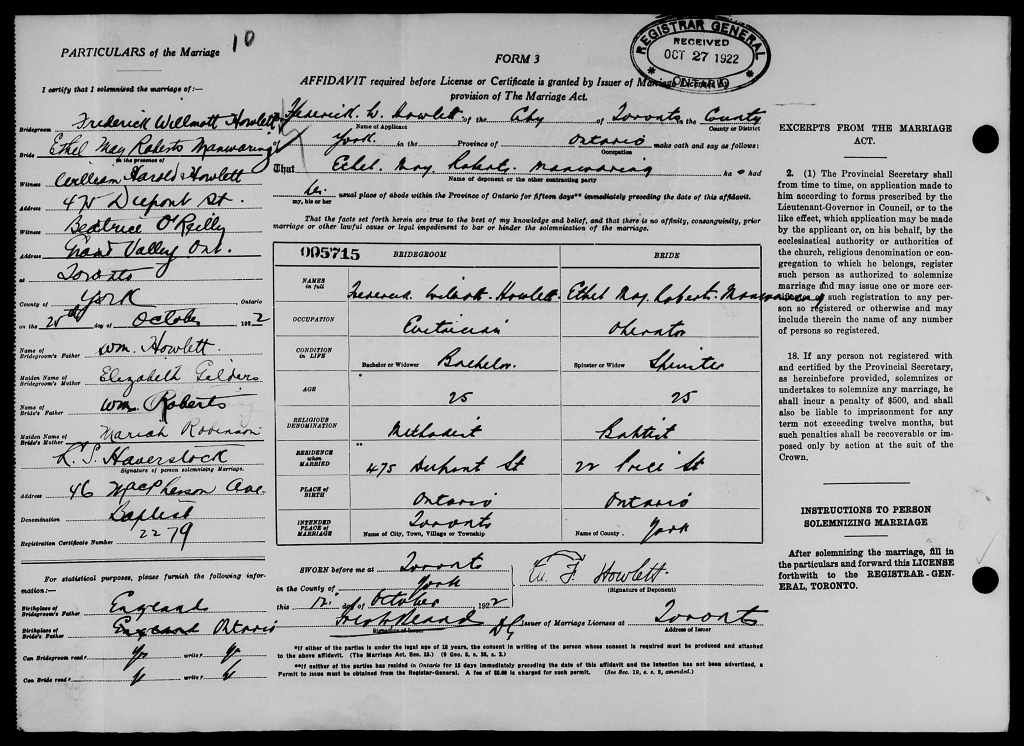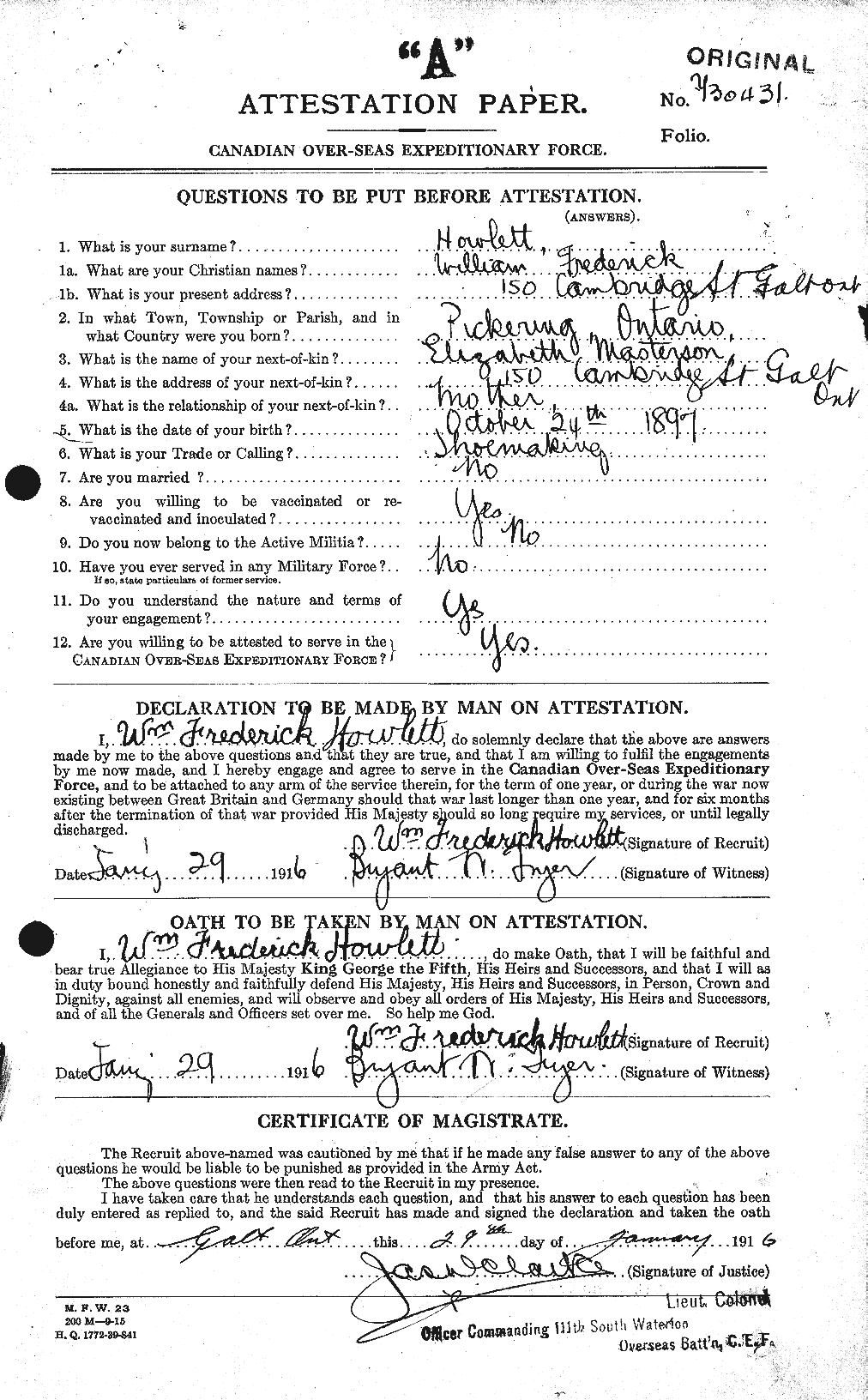 | May 19, 1921 | Updated Address | Address of Private Howlett updated to 475 Dupont Street, Toronto, Ontario. |