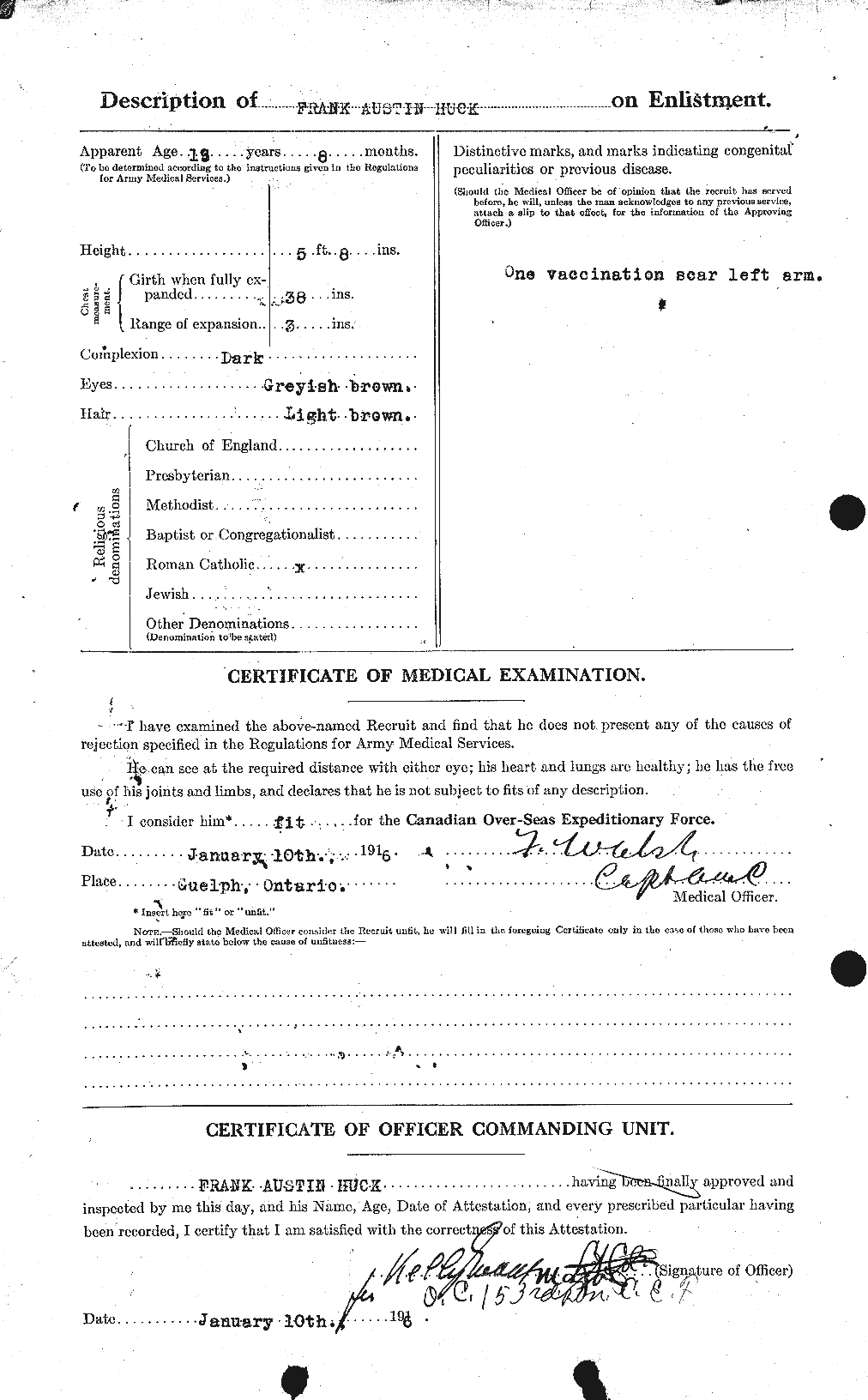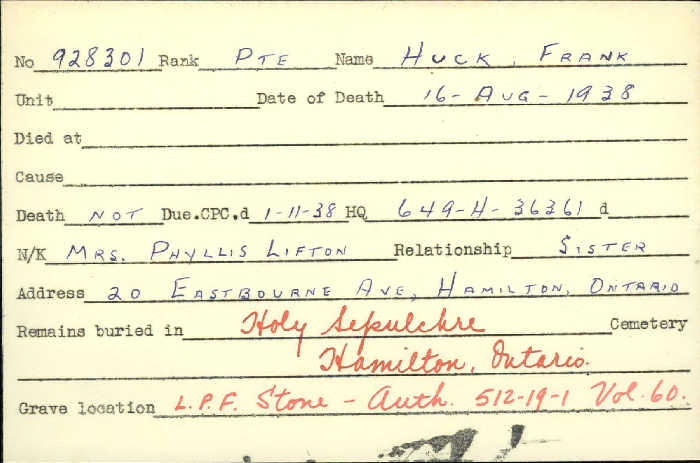 “Trade listed as Laborer. DOB 28-1-87, born Arthur. 5 foot 8 inches. Greyish-brown eyes, light brown hair. Catholic. NOK David Huck, father. Josephine Myers, mother. Enlisted Guelph 10-1-16 (age 18 years 8 months). On 153rd Nominal Roll 5-2-16, no transfers noted. On 153rd Battalion Nominal Rolls as published Guelph Mercury 10-6-16 and 1-12-16. Embarked with 153rd Halifax N.S. SS Olympic 29-4-17. Arrived Liverpool 7-5-17. Assigned 25th Reserve for Training and Administration. Taken on Strength 18th Battalion 28-3-18. Returned to Canada aboard SS Caronia 14-5-19. Demobilized London 24-5-19. Notation on file, died 16-8-38. Holy Sepulchre Roman Catholic Cemetery (Hamilton) records confirm: burial 29-8-38, HS 2E-2-63. Photo: courtesy B. Gilbert.