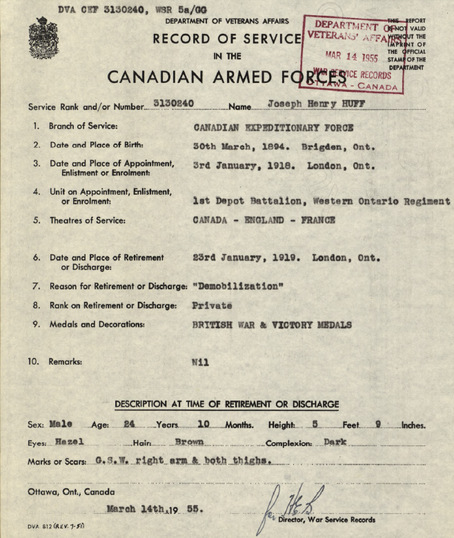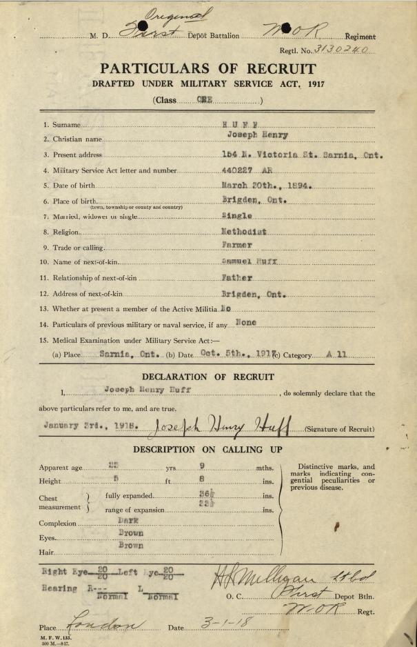 Family Search: When Private Joseph Henry Huff was born on 30 March 1892, in Moore, Lambton, Canada West, British Colonial America, his father, Samuel Huff, was 38 and his mother, Catherine Hayward, was 29. He married Mary Beatrice Lacroix on 2 November 1919, in Sarnia, Lambton, Ontario, Canada. He lived in Lambton, Ontario, Canada for about 10 years and Sarnia, Lambton, Ontario, Canada in 1922. He registered for military service in 1918. In 1918, at the age of 26, his occupation is listed as farmer in Brigden, Lambton, Ontario, Canada. He died in Michigan, United States.