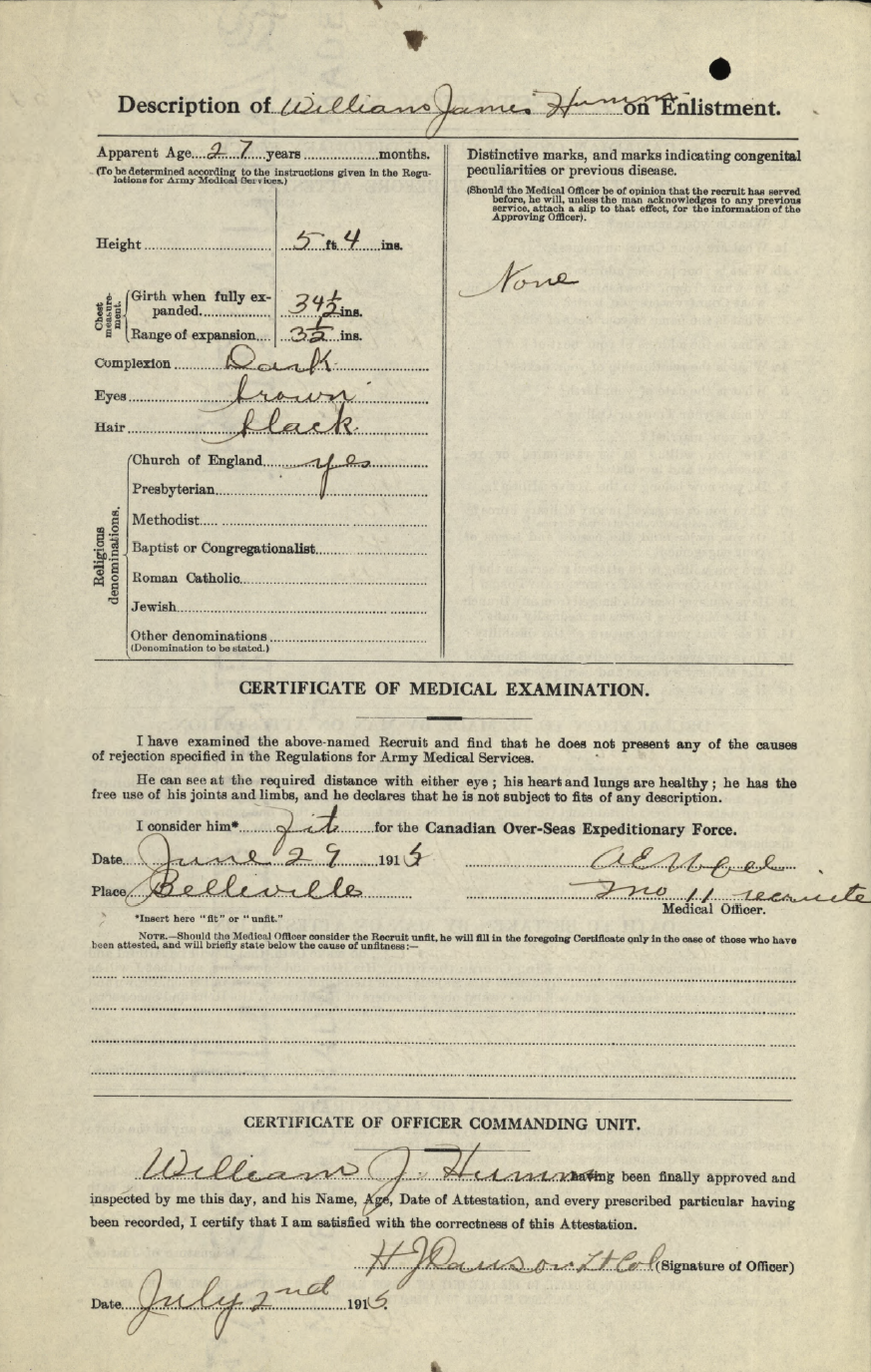He enlisted on 29 June 1915 at Belleville, Ontario with the 59th Battalion. He was from the Orangeville area and it is not known why he enlisted in Belleville.