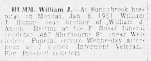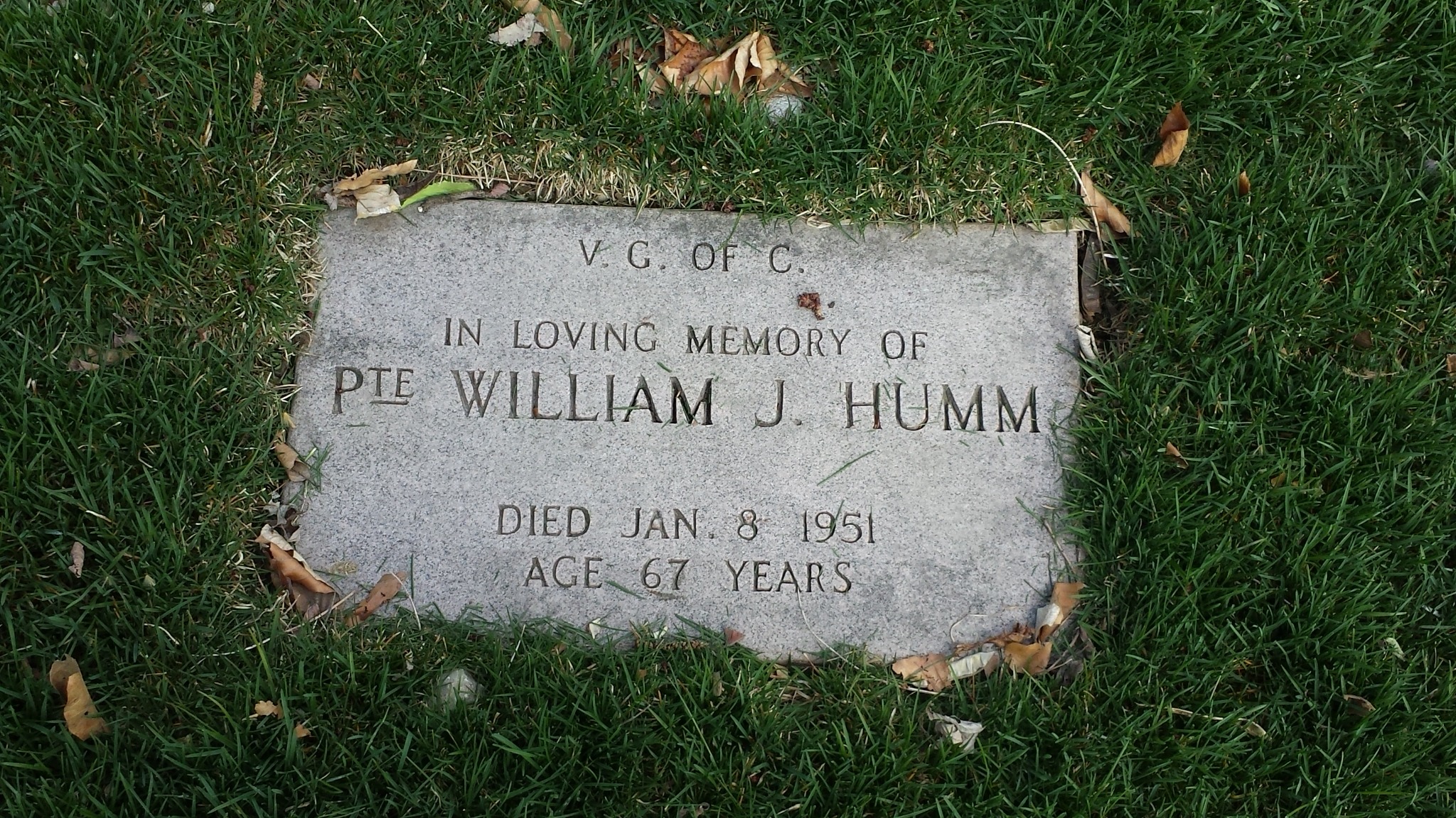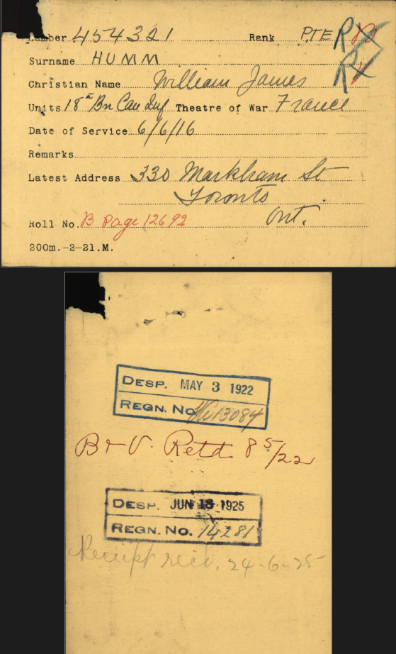 Family Search: Private William James Humm was born on 6 May 1893, in London, England, United Kingdom as the son of Humm. He immigrated to Halifax, Nova Scotia, Canada in 1903. He registered for military service in 1915. In 1916, at the age of 23, his occupation is listed as labourer in Shelburne, Dufferin, Ontario, Canada. He died on 8 January 1951, in Toronto, York, Ontario, Canada, at the age of 57, and was buried in Prospect Cemetery, Toronto, Ontario, Canada.