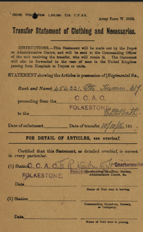 He embarked the SS Olympic at Halifax, Nova Scotia on 5 April 1916, arriving at Liverpool on 11 April 1916.