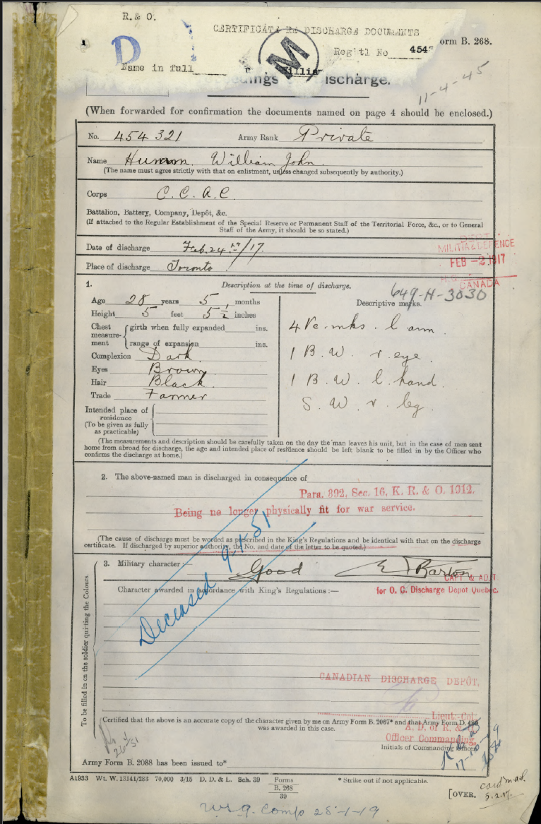 This wound would lead to his discharge on 24 February 1917, at Toronto, Ontario.